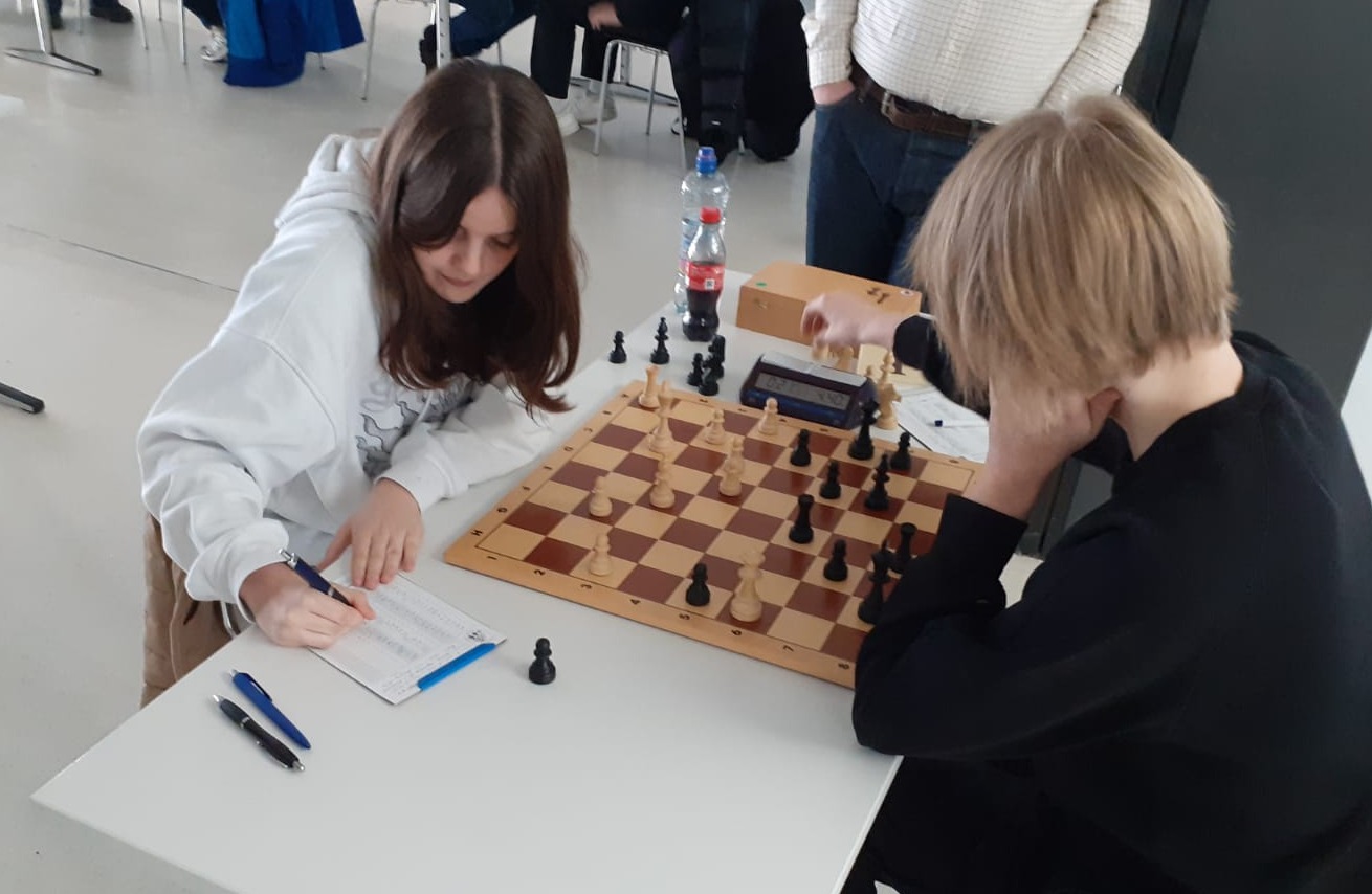 Dennoch gab es individuelle Highlights: Laura rückte diesmal notgedrungen ans Spitzenbrett – als U14-Spielerin – und hatte dort einen Kontrahenten mit 1954 DWZ vor der Nase. Dass sie das nicht groß kümmert, hat sie aber auf den letzten Open schon regelmäßig gezeigt. So schaffte sie auch diesmal das Kunststück und holte den vollen Punkt. Hammer! Auch Mannschaftsführer Johannes musste ans zweite Brett aufrutschen, aber auch ihm gelang eine sehenswerte Partie, ebenfalls gegen einen nominell deutlich stärkeren Gegner. Auch er holte den vollen Punkt.