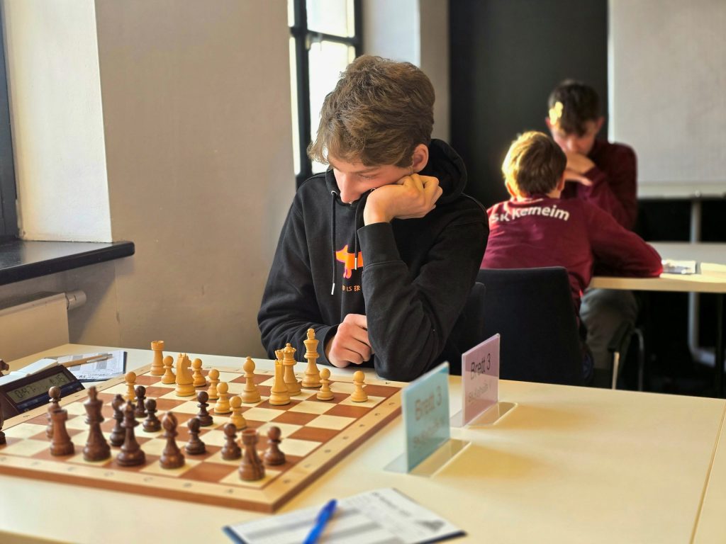 In diesem Derby ging es deutlich schneller zur Sache. Maxl, der eigentlich in den U20 Kreisligen an den Start geht, wurde für diesen Spieltag nach oben gezogen und sprang tapfer „ins kalte Wasser“ zu den Großen. Er hielt gegen Simon lange gut mit, musste aber dann nach ein paar taktischen Ungenauigkeiten das Abenteuer Oberpfalzliga aufgeben. Anschließend entwickelten sich wesentlich spannendere Partien als im Parallelkampf. Am Spitzenbrett musste sich Maxim gegen Johannes geschlagen geben, nachdem eine trickreiche Fesselung ihn eine Figur kostete und kurz darauf auch die Partie vorzeitig beendete – 1:1 Ausgleich.