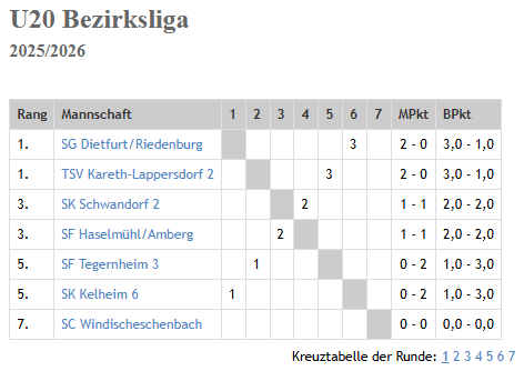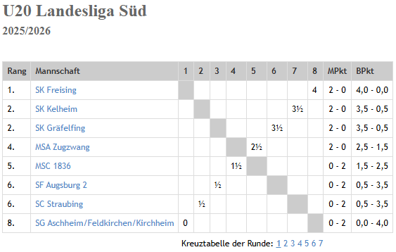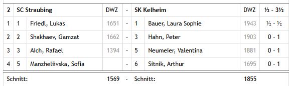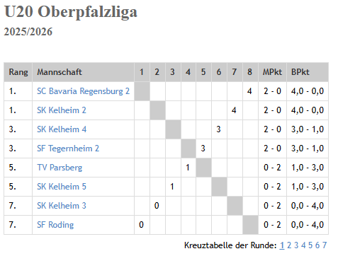 In der Tabelle teilt sich Kelheim zunächst Platz zwei mit SK Gräfelfing. SK Freising führt durch einen „Whitewash“ mit einem halben Brettpunkt mehr.