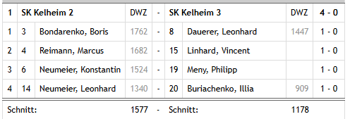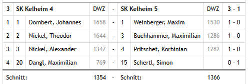 In Summe war es ein sehr erfolgreicher erster Spieltag mit vielen schönen Partien für die Kelheimer Mannschaften – auch die einzige Niederlage des Tages von Kelheim VI kann im Nachhinein durchaus als positives und lehrreiches Duell für alle Spieler bezeichnet werden.
