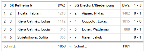 Als einzige Mannschaft, die nicht vom SK Kelheim kam, durfte SKK VI die SG Riedenburg/Dietfurt in Kelheim begrüßen. Mit Fabian Ticala, Lukas Riera Galmes, Lucia Riera Galmes und Sofiia Strielnikova trat ein schlagkräftiges Quartett an. Auf dem Papier wäre die SG in Bestbesetzung klarer Favorit gewesen, konnte allerding nicht in dieser Aufstellung an den Start gehen.