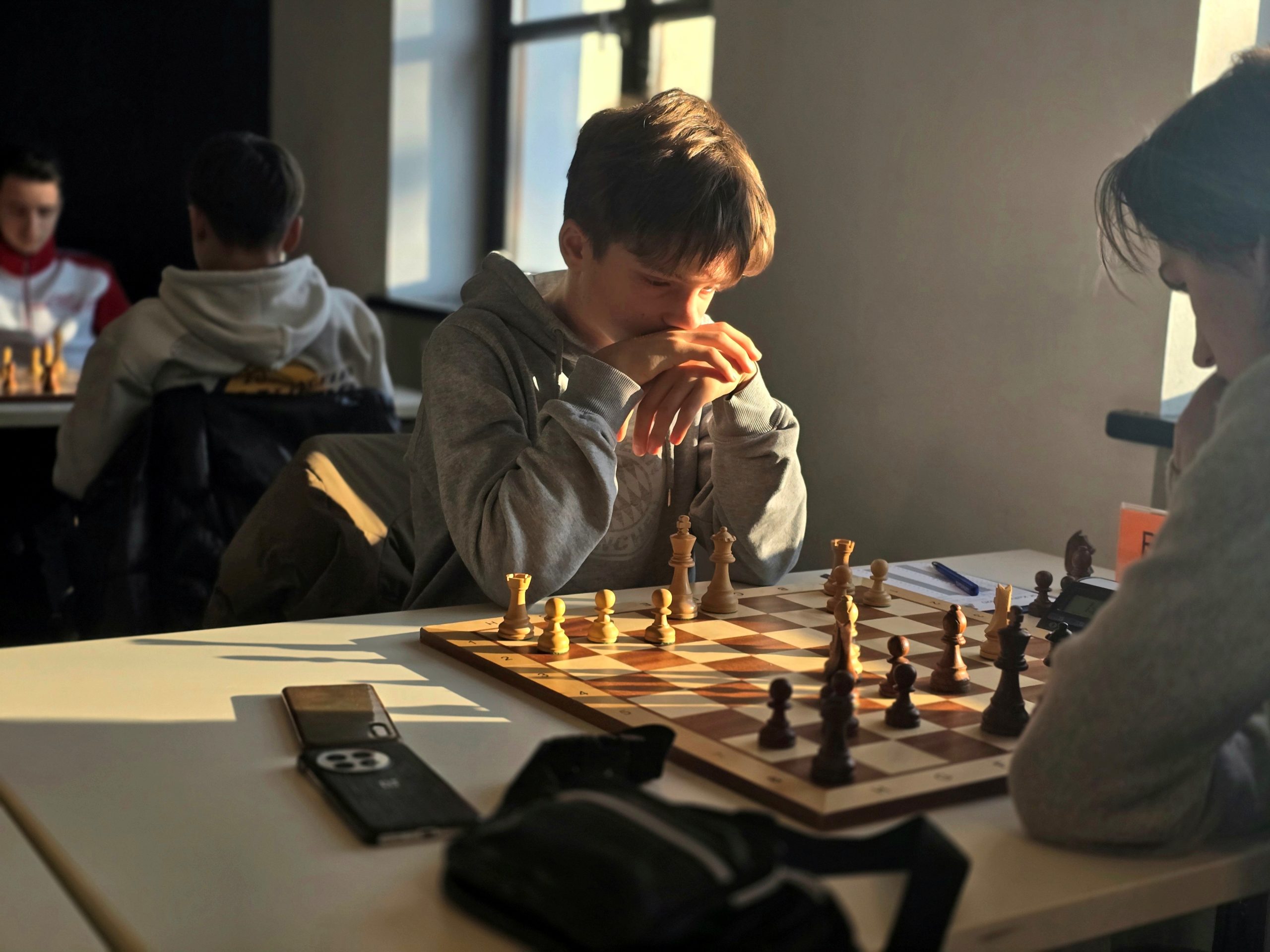 Mit dem klaren Ziel, dieses Jahr den Aufstieg nicht nur zu schaffen, sondern auch tatsächlich eine Liga nach oben zu rücken, wurde an den beiden verbleibenden Brettern weiter gekämpft. Nach knapp einer weiteren Stunde endeten die Partien an Brett 3 und 4 nahezu zeitgleich. Konny verwertete seinen Materialvorteil im Turmendspiel sicher gegen Philipp, und auch Leo tat es seinem jüngeren Bruder gleich – er hatte sich gegen Illia ebenfalls Mehrmaterial erarbeitet und brachte die Partie ohne Probleme über die Ziellinie.