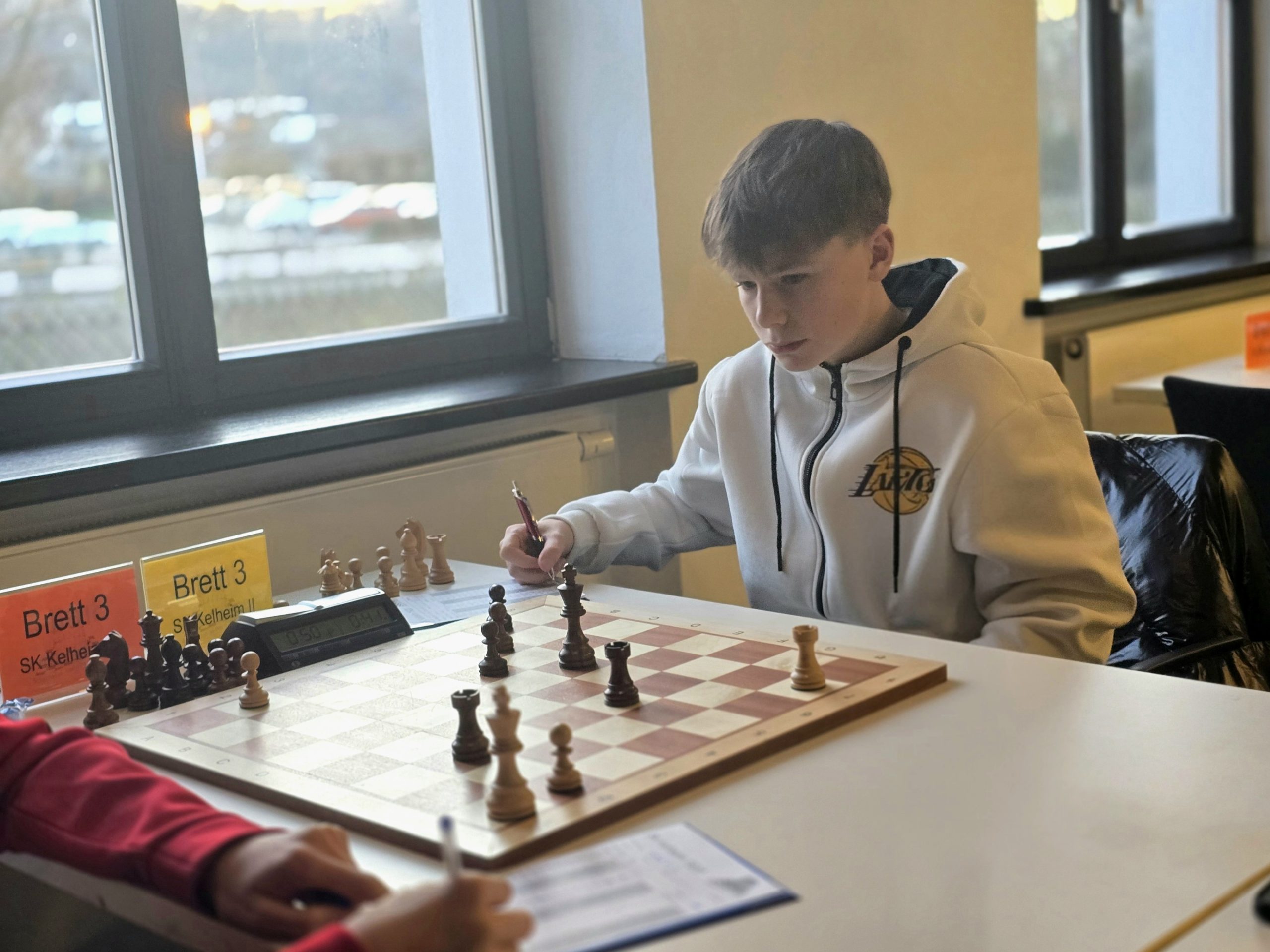 Auch in der Bezirksliga wurde hart um jeden Punkt gekämpft – niemand wollte seine Mannschaft früh in Rückstand bringen. Als erstes musste jedoch Fabian an Brett 1 die Segel streichen. Er hatte bereits in der Eröffnung eine riskante Variante gewählt und dabei ein starkes Manöver seines Gegners übersehen, das in einem Springermatt auf f6 endete. Auch Lucia auf Brett 3 konnte keinen Zähler nach Kelheim holen. Sie verlor bereits in der Eröffnung eine Leichtfigur, kämpfte jedoch tapfer weiter, in der Hoffnung auf einen Fehler ihres Gegners. Dieser blieb aus, und so stand es bereits 0:2.