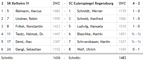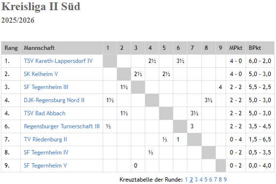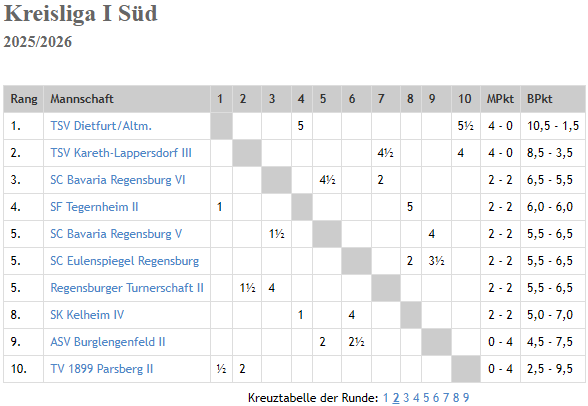 In der Tabelle der Kreisliga I Süd haben wir nun die kuriose Situation, dass der Großteil der Teilnehmer ein ausgeglichenes Punktekonto von 2:2 aufweist. Da Kelheim die wenigsten Brettpunkte hat, bleibt aktuell nur Rang 8 in der Zehnerstaffel. Doch mit Vorstellungen wie der heutigen dürfte das nicht lange so bleiben.