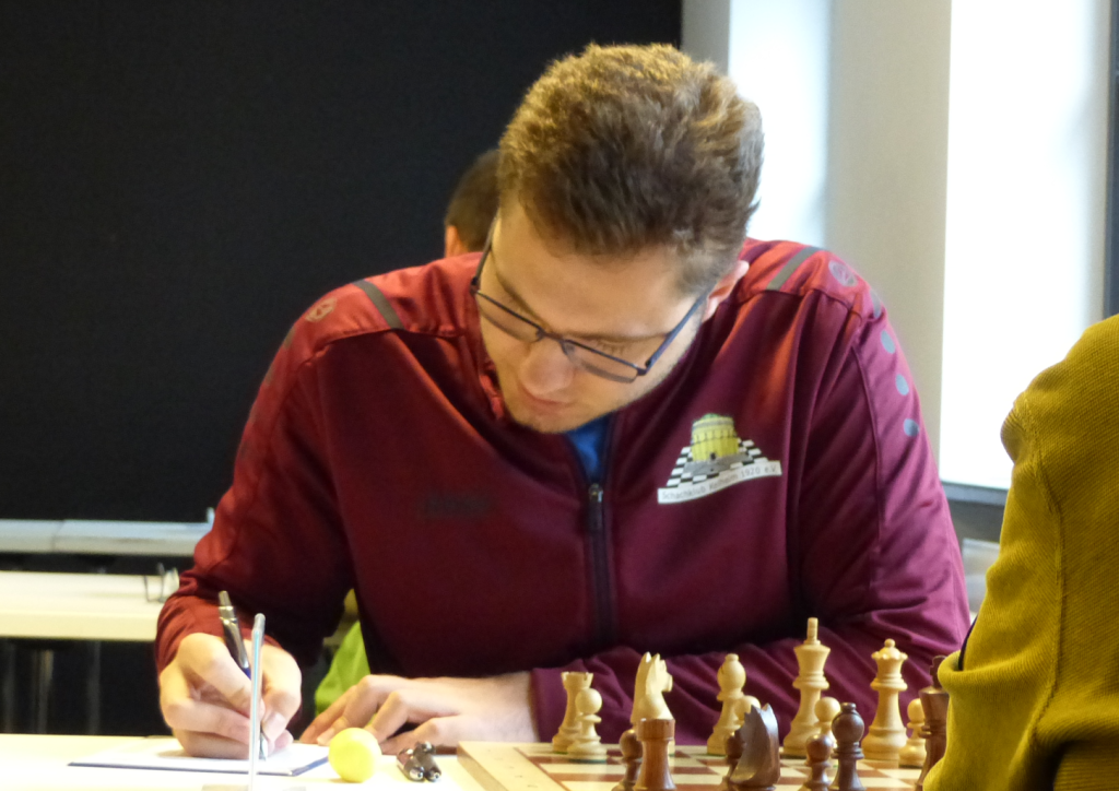 Doch kurz nach 11 Uhr ging es plötzlich Schlag auf Schlag. Andreas Gegner versuchte, mit dem Turm auf der vorletzten Reihe die Schlinge enger zu ziehen, übersah jedoch, dass das Feld von der anderen Seite der Diagonalen gedeckt war. Mit einer vollen Schwerfigur Vorsprung ließ sich Andreas das nicht mehr nehmen und brachte das Team 1:0 in Führung.