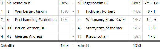 Damit stand es 1,5:1,5 und alles hing von Werner ab, der sich in einer Zeitnotschlacht mit seinem Gegner befand. Als sich der Staub gelegt hatte und die Zeitkontrolle geschafft war, erkämpfte sich Werner einen Bauern Vorsprung und schob den Gegner regelrecht zusammen. Allerdings hatte jener gleich zwei entfernte Freibauern, Werner musste also Obacht geben, dass ihm nicht einer durchflutscht. Nach über vier Stunden hatte der Gegner genug gesehen und gab sich geschlagen. Damit war mit 2,5:1,5 der zweite Sieg von SKK V in der laufenden Saison im Sack.