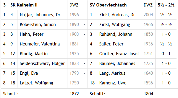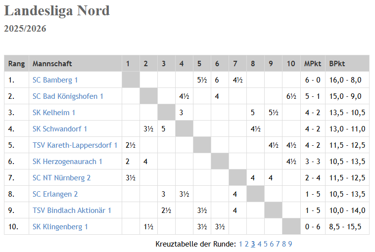 Somit steht die erste Niederlage der Saison für unsere erste zu Buche, unter Anbetracht, dass die Gegner auf Brett 1-3 mit Titelträgern angetreten sind, ist das aber trotzdem ein gutes und erfolgreiches Ergebnis. Nach den ersten drei Spieltagen präsentiert sich die Mannschaft damit sehr gut in der Landesliga, aufgrund der Siege von Bamberg und Bad Königshofen musste die Tabellenführung abgegeben werden und in der Tabelle geht es leicht nach unten auf Tabellenplatz drei.