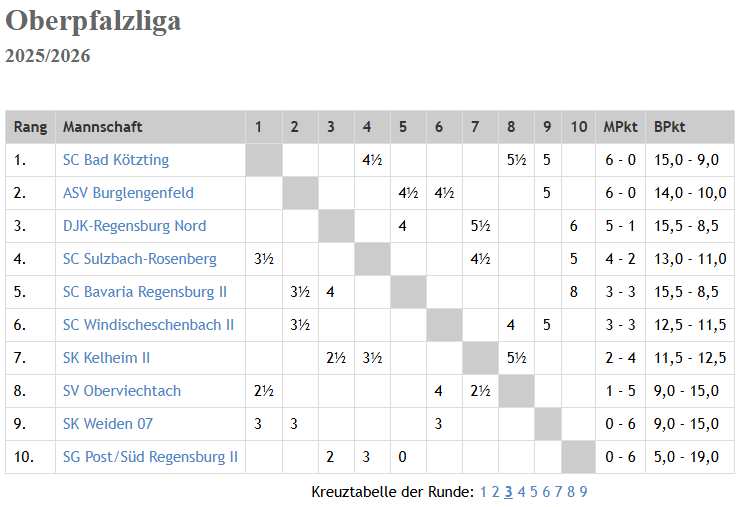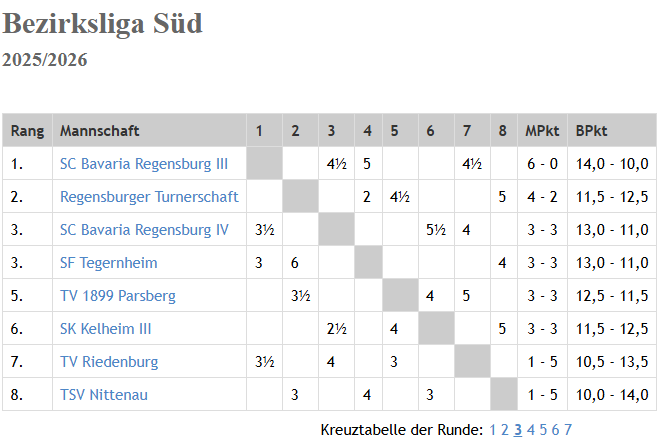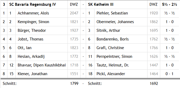 Für die Tabelle hat die Niederlage natürlich erst mal klare Auswirkungen, es geht vorerst ins untere Tabellenmittelfeld. Aber die Mannschaft von Bavaria Regensburg IV ist in dieser Aufstellung definitiv einer der heißesten Kandidaten auf den Aufstieg, da müssen die anderen Mannschaften auch erstmal zeigen, was sie in dem Duell aufs Brett bekommen.
