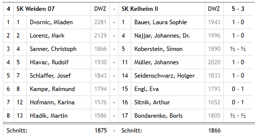 In der vierten Runde trat die zweite Mannschaft des SK Kelheim bei der ersten Mannschaft des SK Weiden an. Nach einer problemlosen Anreise startete der Mannschaftskampf pünktlich um 9 Uhr. Die stark besetzten Spitzenbretter der Gastgeber ließen bereits im Vorfeld eine grobe Marschroute erkennen: An den hinteren Brettern sollten die Punkte geholt werden, während man vorne versuchte, so gut wie möglich mitzuhalten.