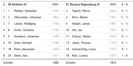 Max Deml holte bei seinem Debut in der dritten Mannschaft gleich einen Sieg an Brett 8. Wolfgang Latzel konnte sich an Brett 3 mit Schwarz sicher in ein Remis verteidigen, während Johannes Obermeier an Brett 2 in der Rubinstein – Variante keinen entscheidenden Vorteil erlangen konnte und ebenfalls Remis spielte.