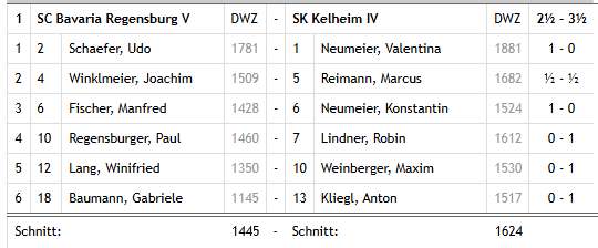 Zum letzten Spieltag vor der Winterpause war die vierte Mannschaft des SK Kelheim am vergangenen Sonntag beim SC Bavaria Regensburg V zu Gast. Erneut stellte sich eine überaus junge Delegation der Herausforderung: Mit Valentina Neumeier, Marcus Reimann, Konstantin Neumeier, Mannschaftsführer Robin Lindner und Maxim Weinberger lag der Altersschnitt an den Brettern eins bis fünf bei gerade einmal 17 Jahren. Komplettiert wurde das Sextett von Veteran Anton Kliegl am sechsten Brett.