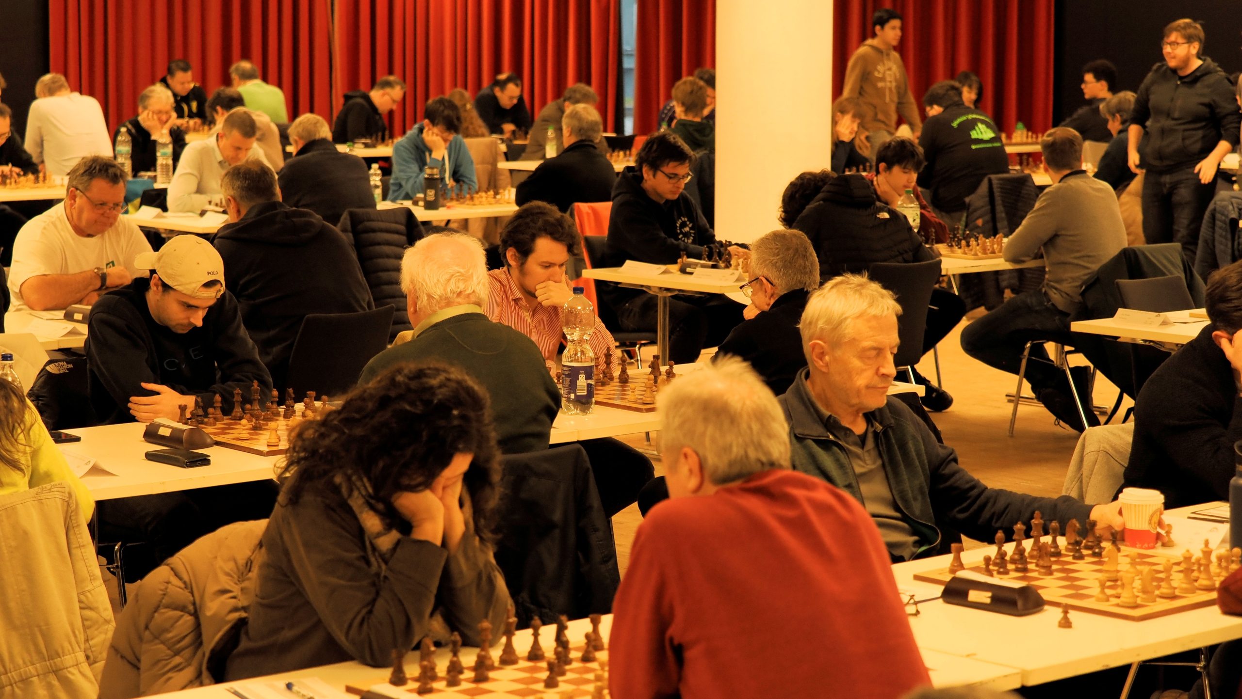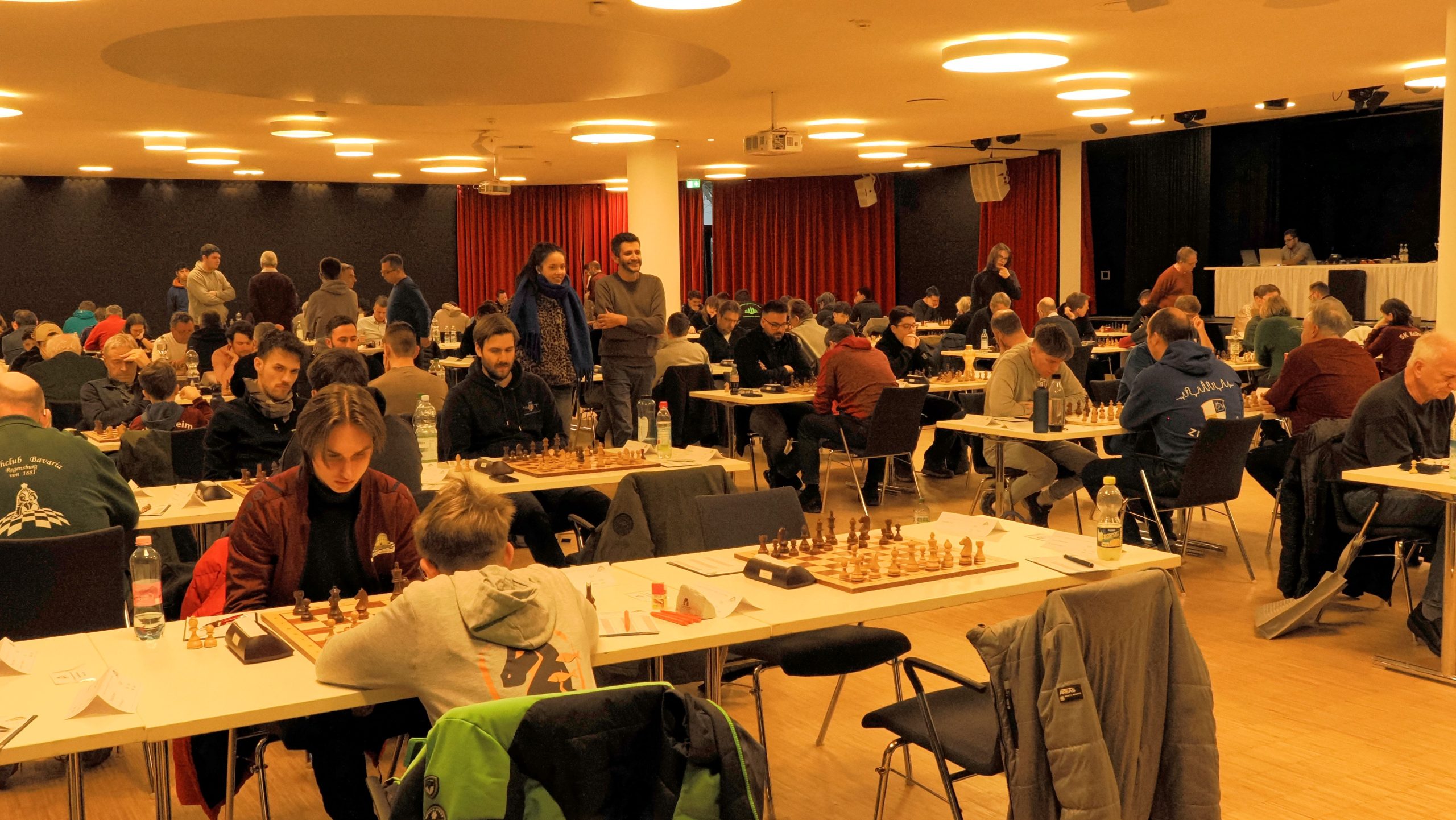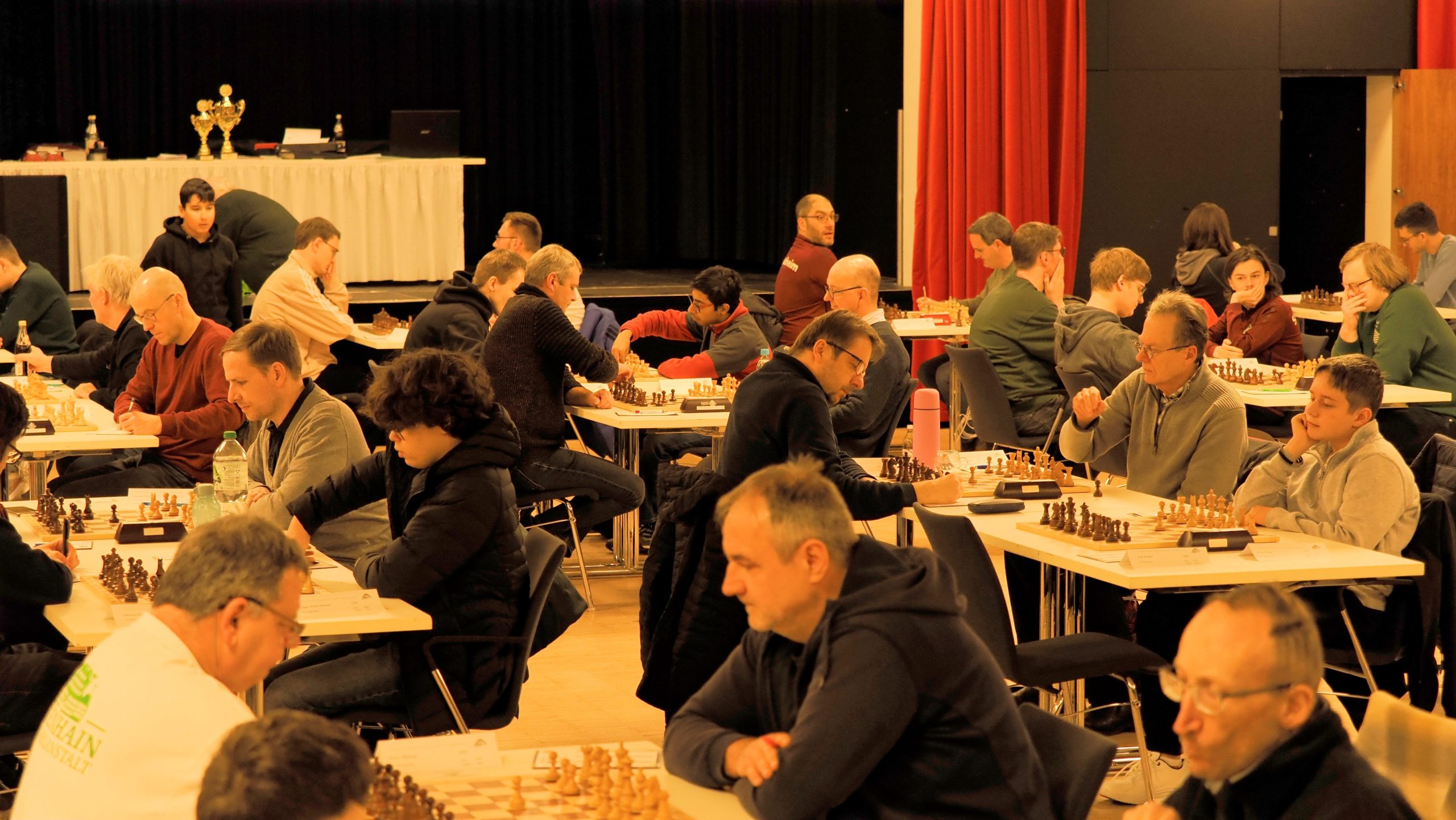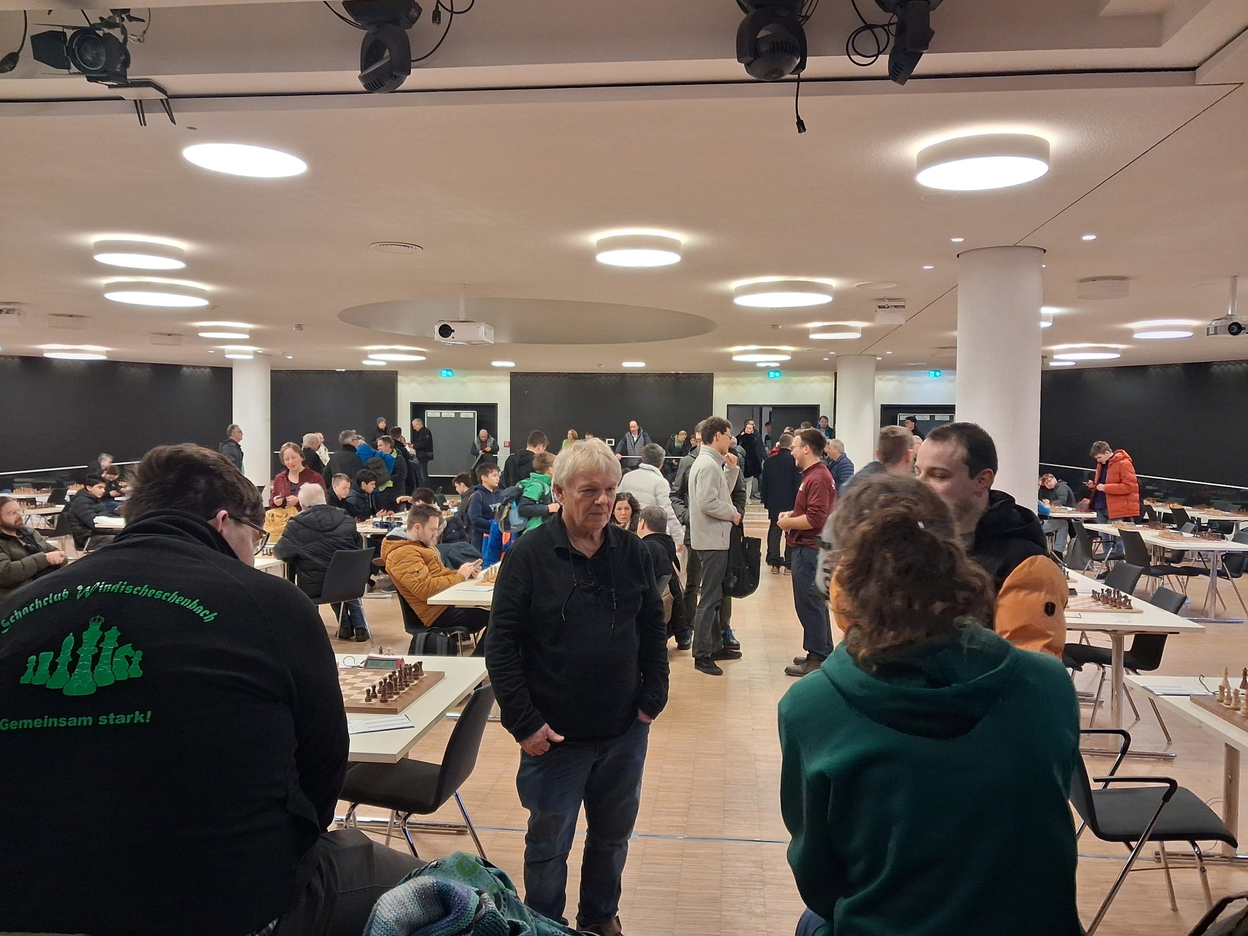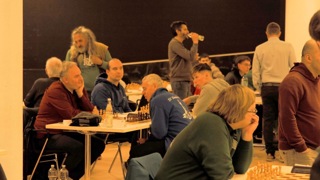 Ab etwa 16 Uhr räumten zahlreiche Mitglieder gemeinsam mit einigen Trainern die runden Tische der Weihnachtsfeier aus dem Saal. Anschließend wurden rund 90 Tische und 180 Stühle sowie Bretter und Figuren im großen Saal für das Hauptturnier und im Nebenraum bei der Rezeption für das Begleitturnier aufgebaut. Darüber hinaus wurden der Analyseraum vorbereitet, die DGT-Bretter und das Mikrofon eingerichtet, Aushänge angebracht und die unzähligen weiteren Kleinigkeiten erledigt, die zur Vorbereitung eines solchen Turniers gehören.