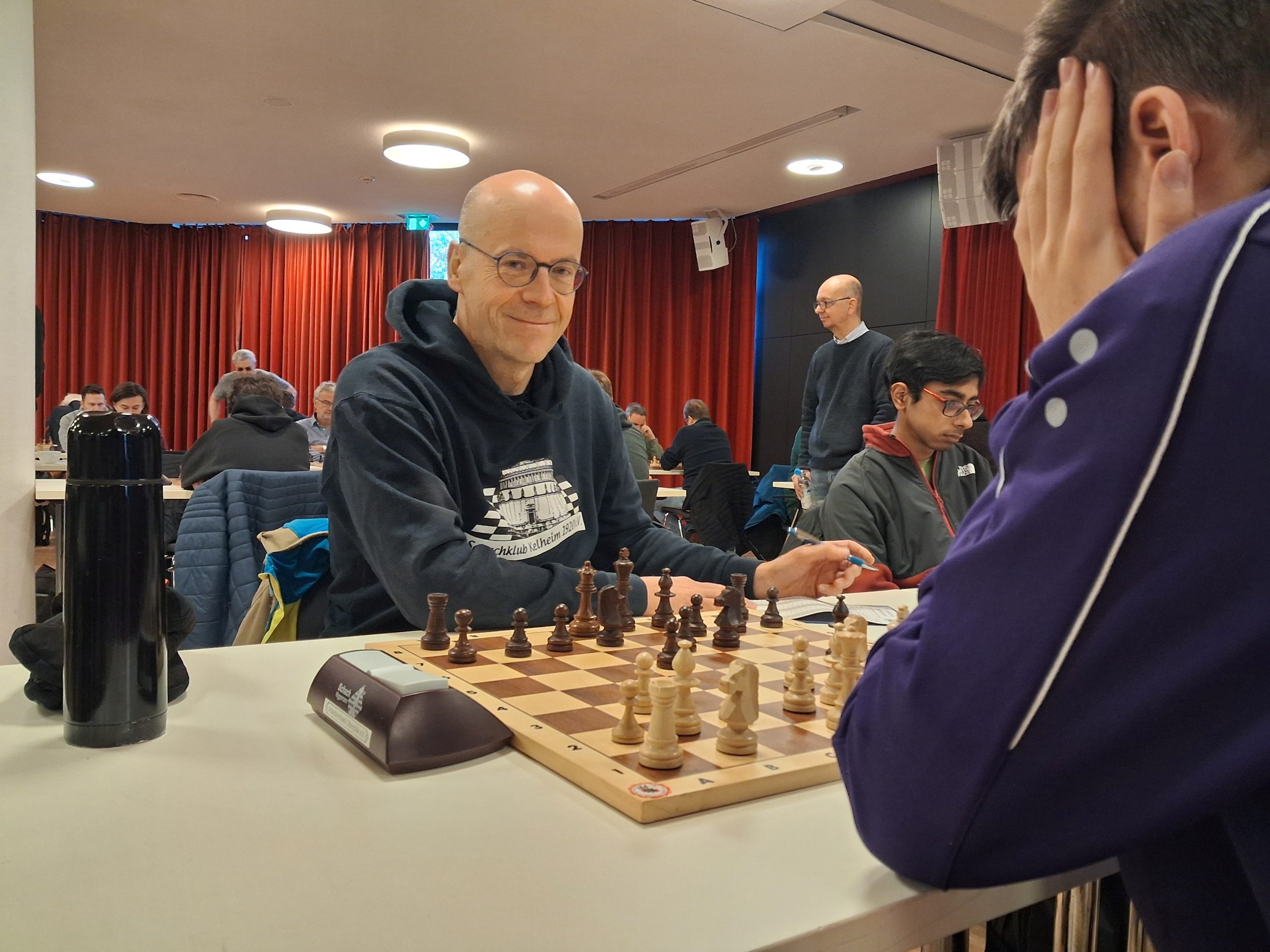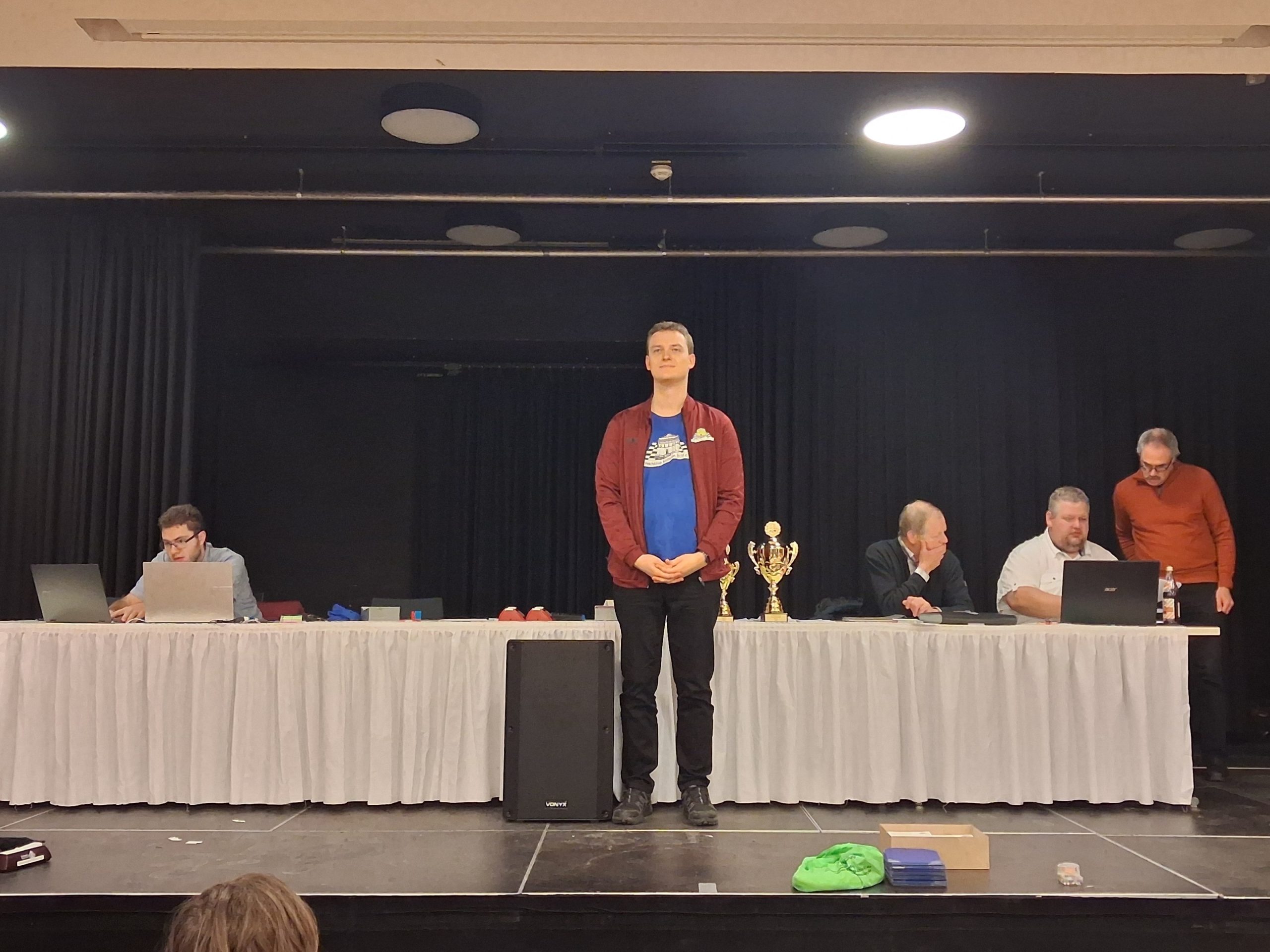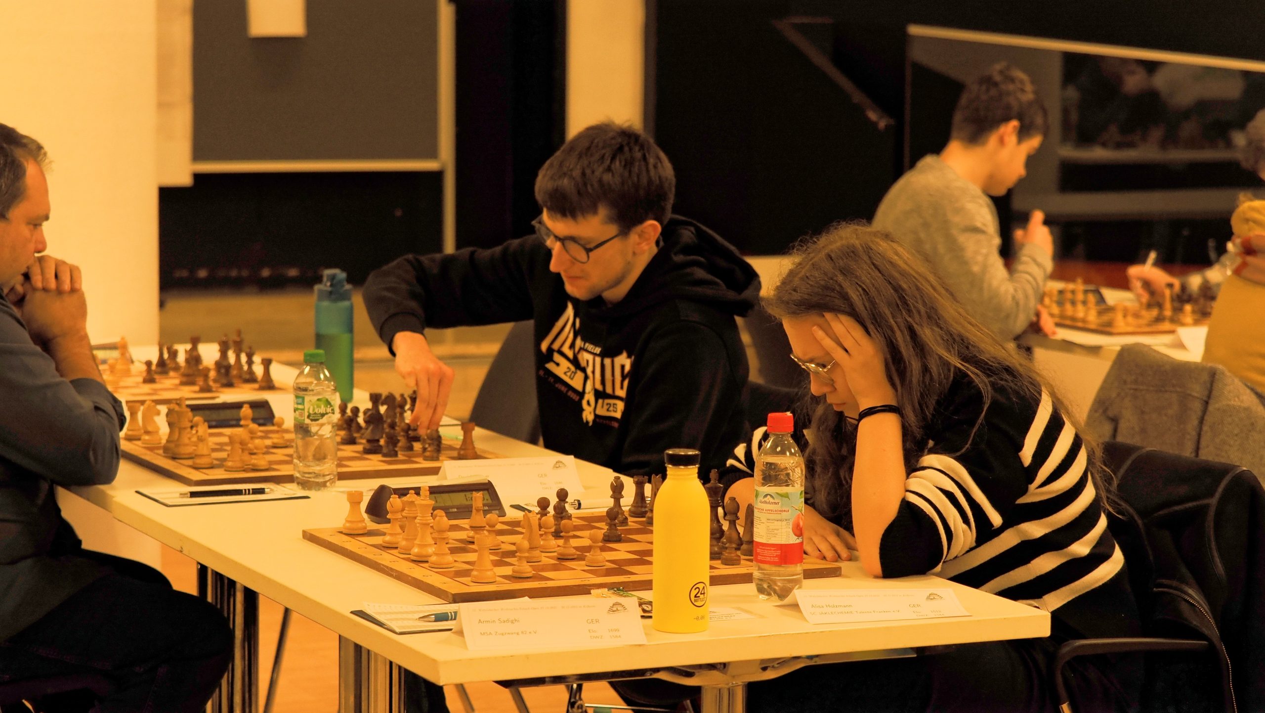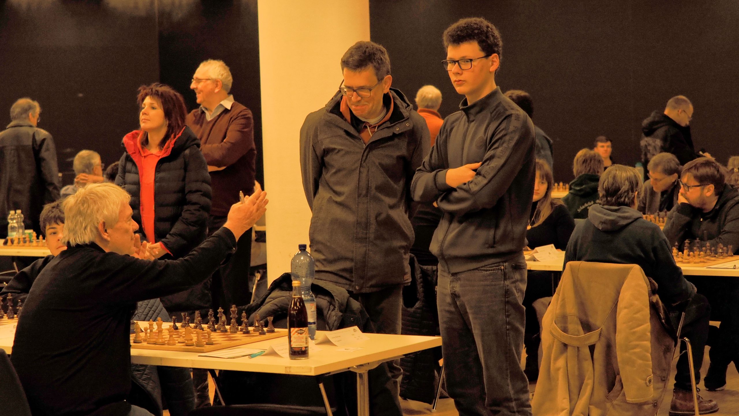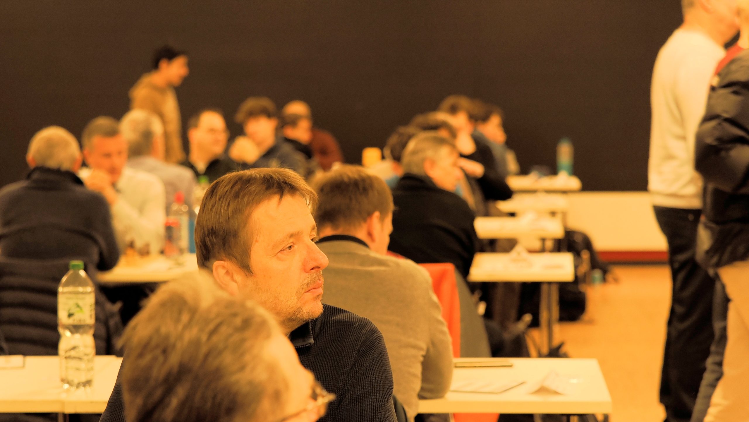 Ab etwa 16 Uhr räumten zahlreiche Mitglieder gemeinsam mit einigen Trainern die runden Tische der Weihnachtsfeier aus dem Saal. Anschließend wurden rund 90 Tische und 180 Stühle sowie Bretter und Figuren im großen Saal für das Hauptturnier und im Nebenraum bei der Rezeption für das Begleitturnier aufgebaut. Darüber hinaus wurden der Analyseraum vorbereitet, die DGT-Bretter und das Mikrofon eingerichtet, Aushänge angebracht und die unzähligen weiteren Kleinigkeiten erledigt, die zur Vorbereitung eines solchen Turniers gehören.