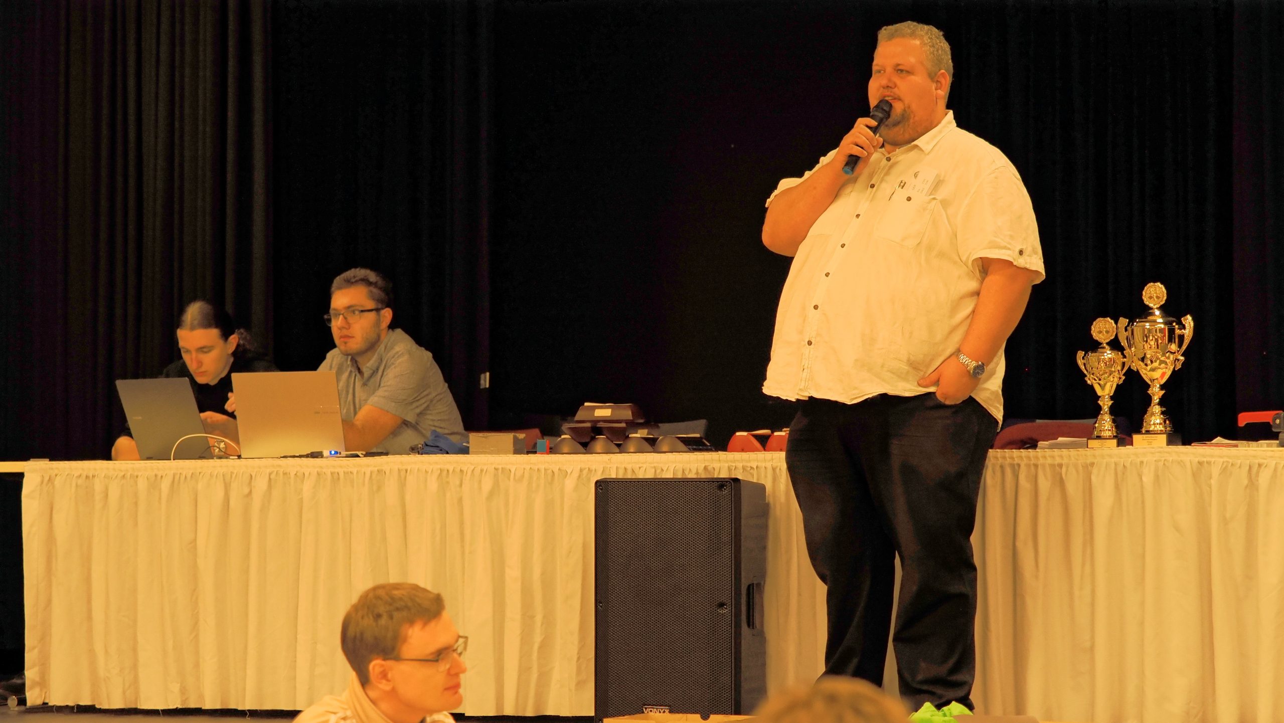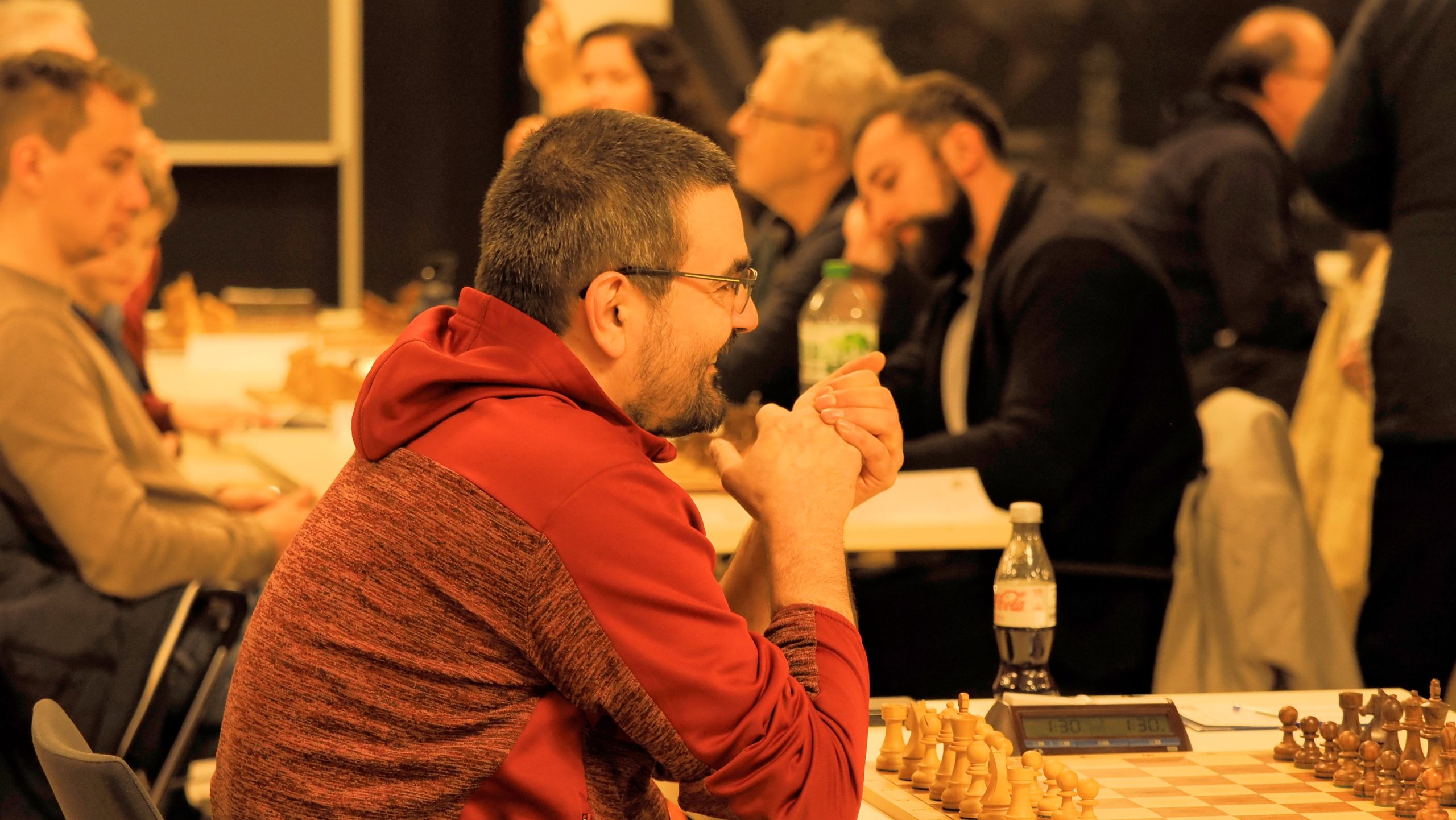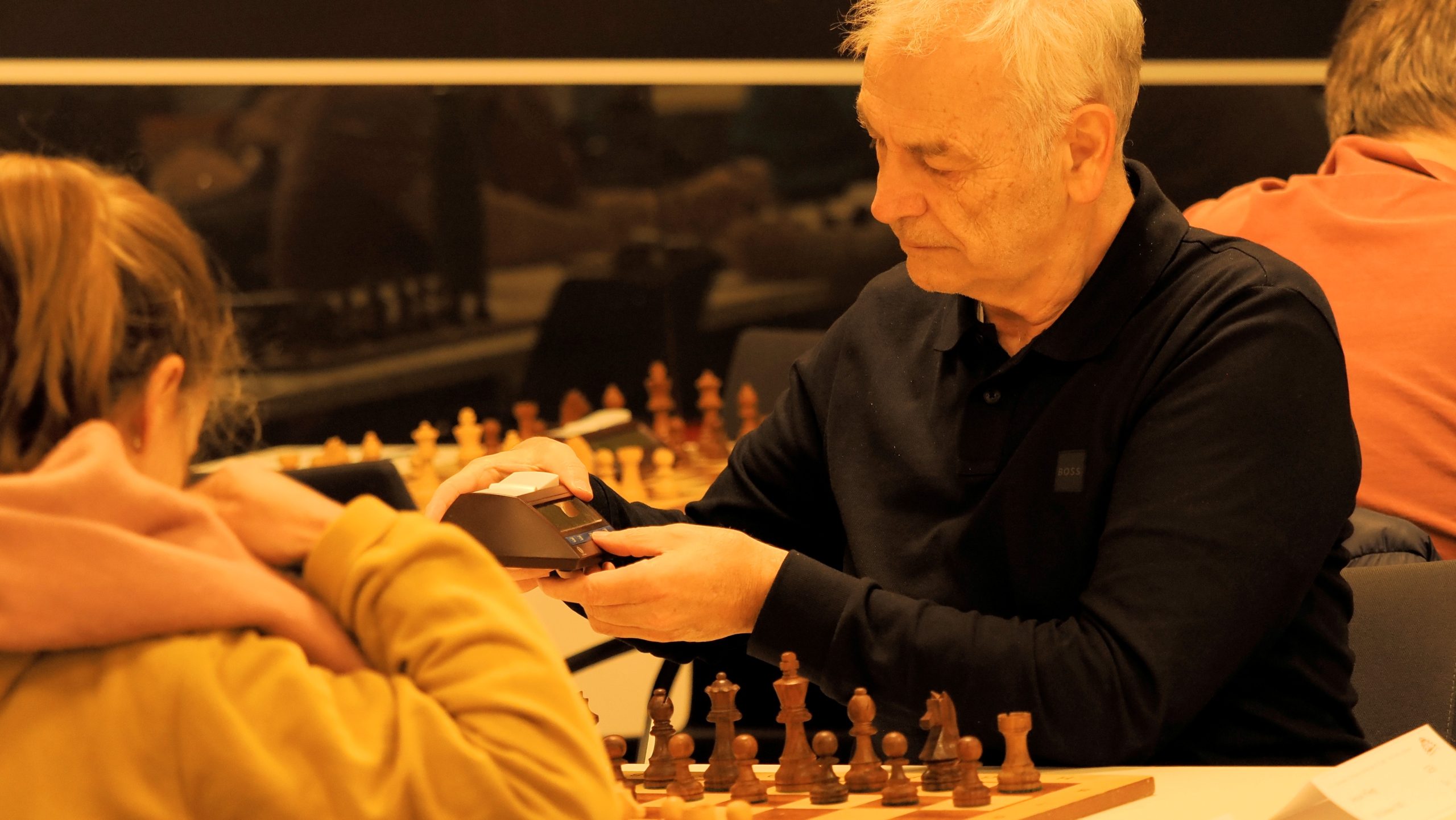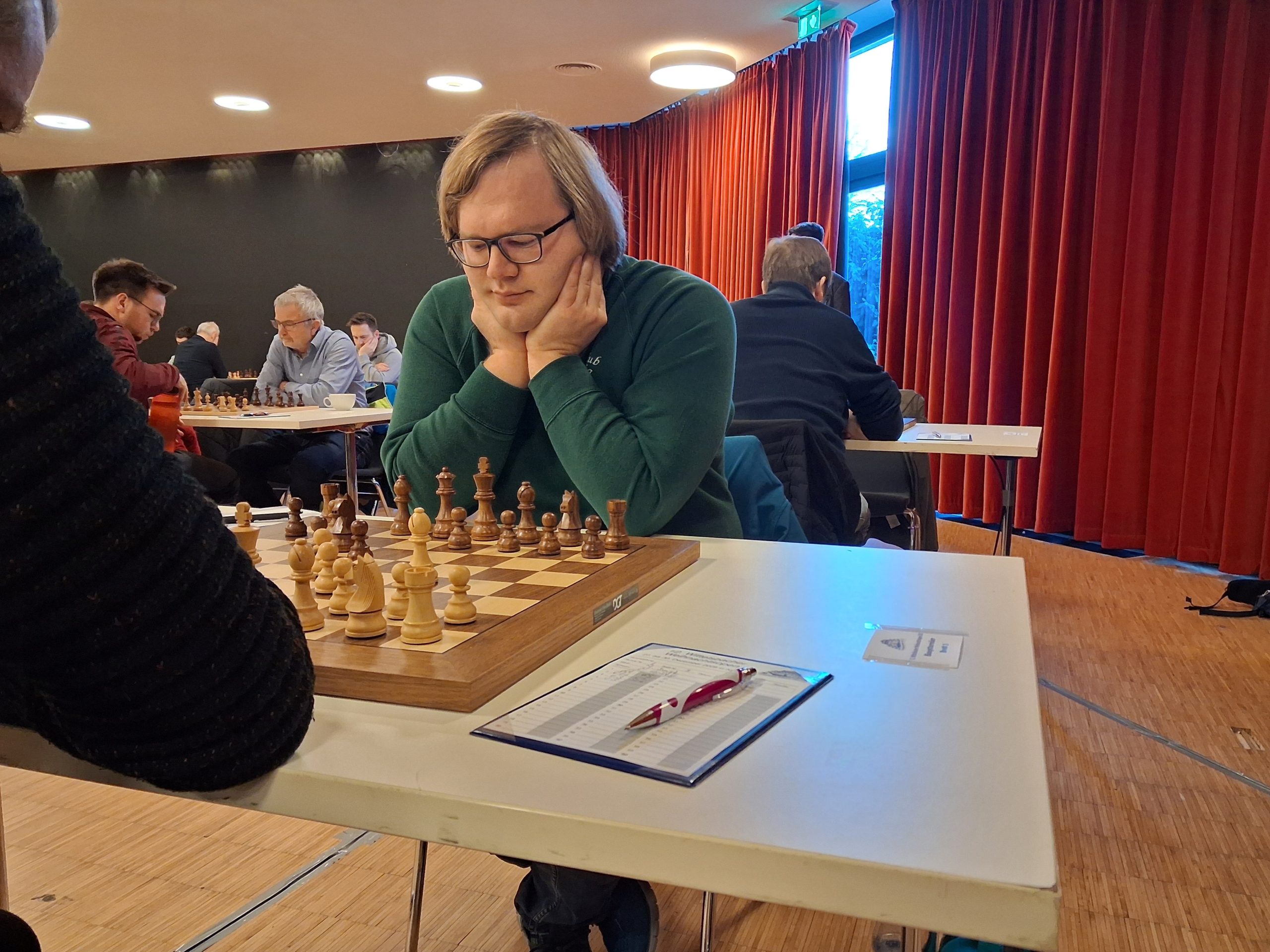 Ab etwa 16 Uhr räumten zahlreiche Mitglieder gemeinsam mit einigen Trainern die runden Tische der Weihnachtsfeier aus dem Saal. Anschließend wurden rund 90 Tische und 180 Stühle sowie Bretter und Figuren im großen Saal für das Hauptturnier und im Nebenraum bei der Rezeption für das Begleitturnier aufgebaut. Darüber hinaus wurden der Analyseraum vorbereitet, die DGT-Bretter und das Mikrofon eingerichtet, Aushänge angebracht und die unzähligen weiteren Kleinigkeiten erledigt, die zur Vorbereitung eines solchen Turniers gehören.