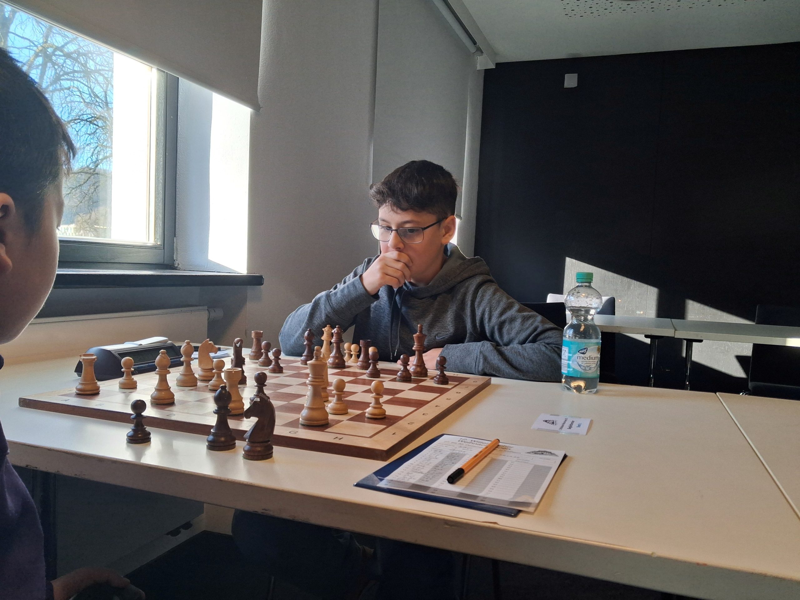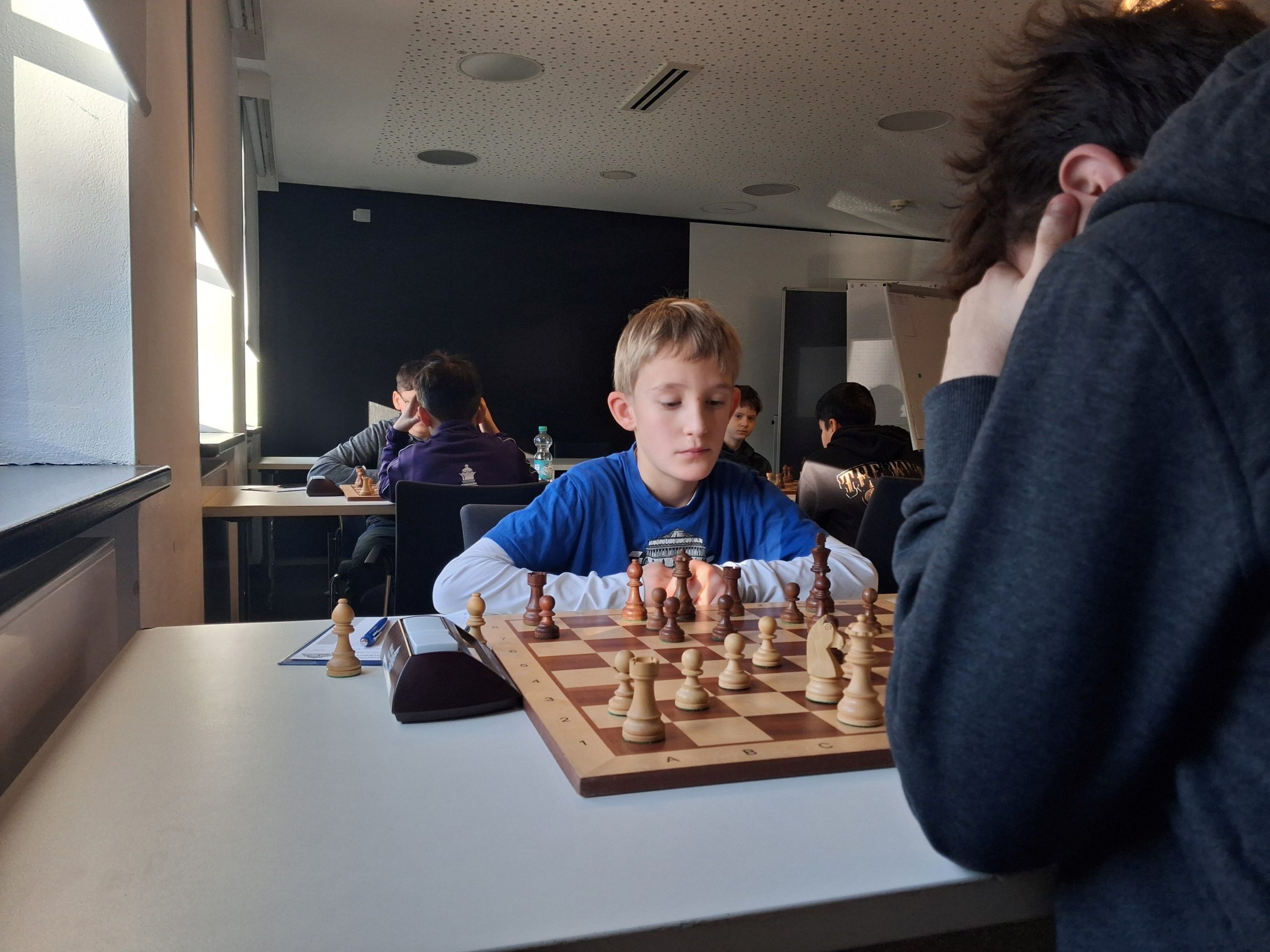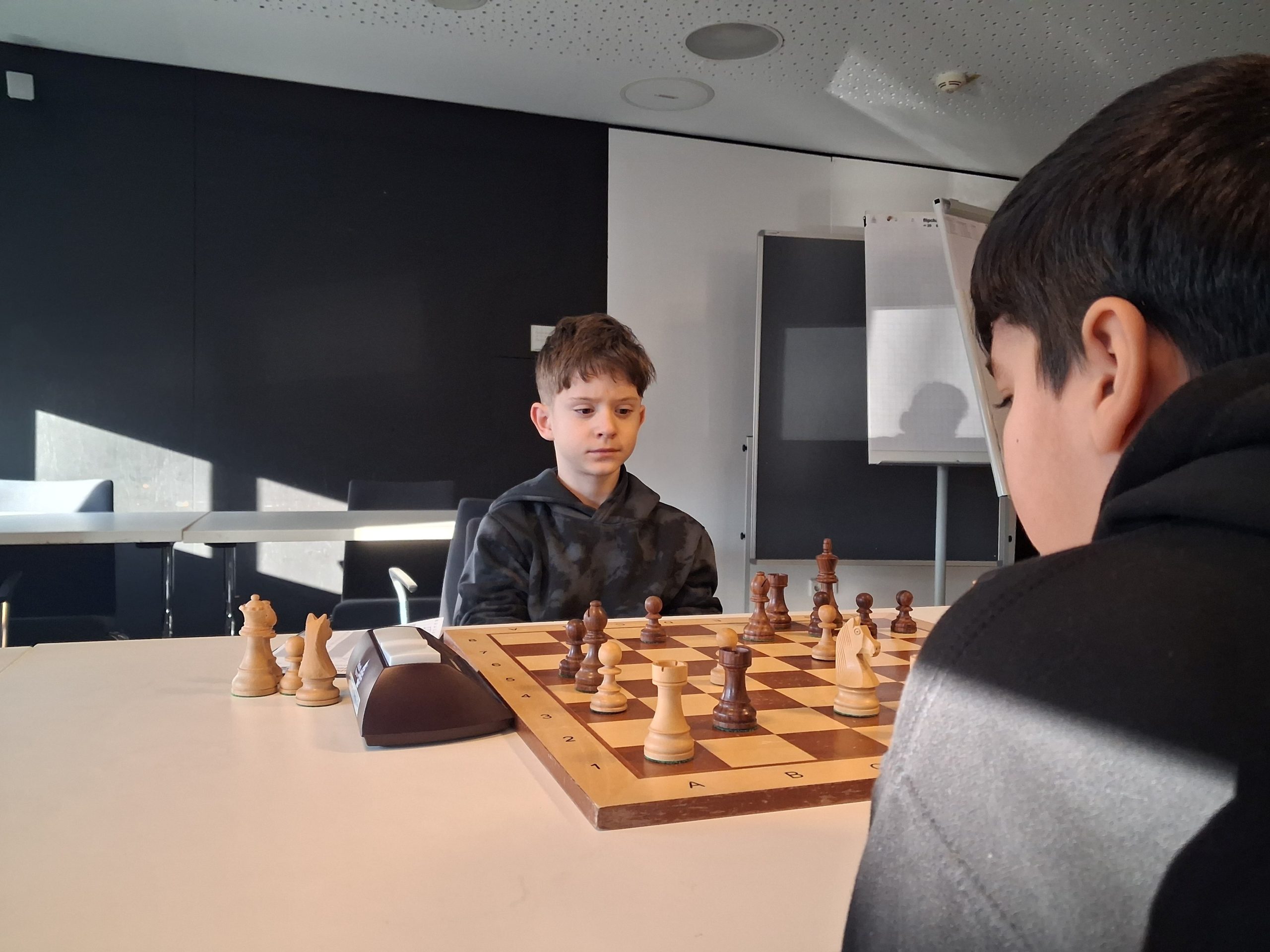 Während im Hauptturnier noch fast keine Partie zu Ende gegangen ist, hat das Begleitturnier gegen 12:30 Uhr bereits die erste Runde hinter sich. Fabian, Anton und Illia gingen siegreich aus ihren Partien hervor.