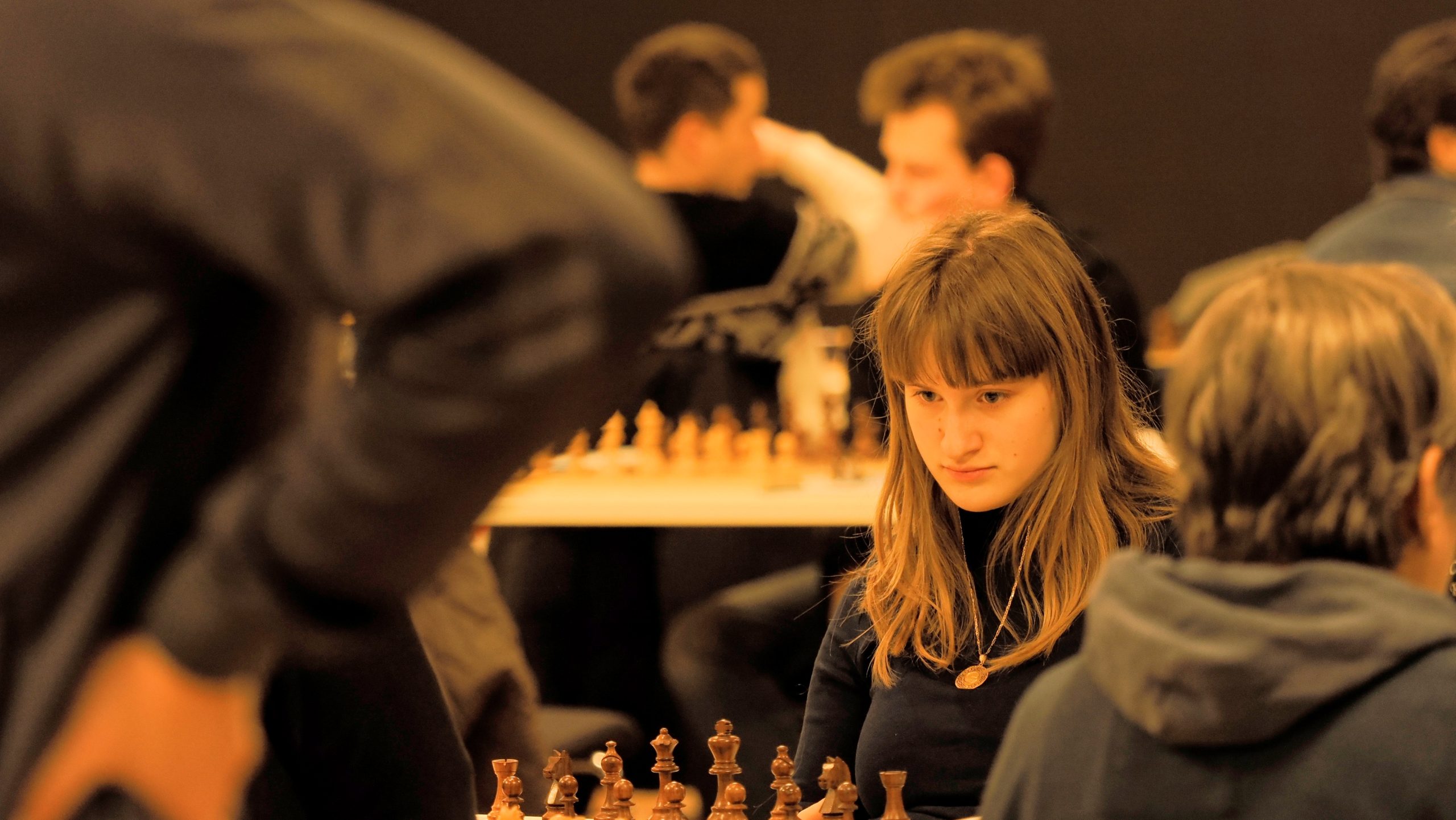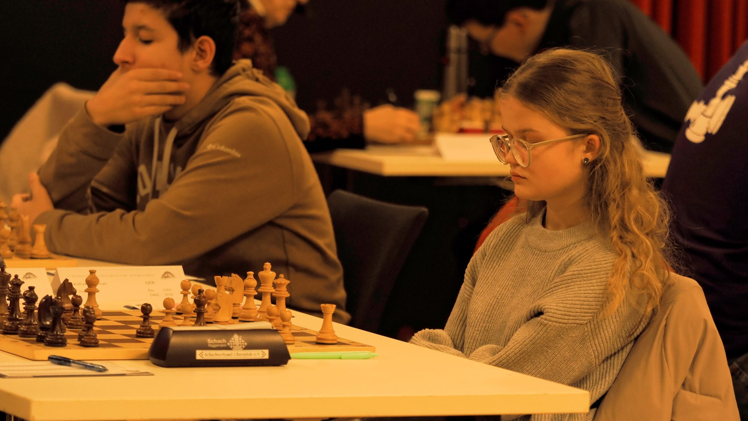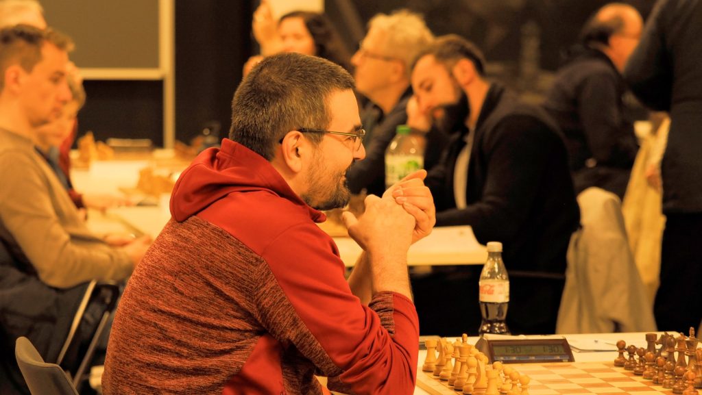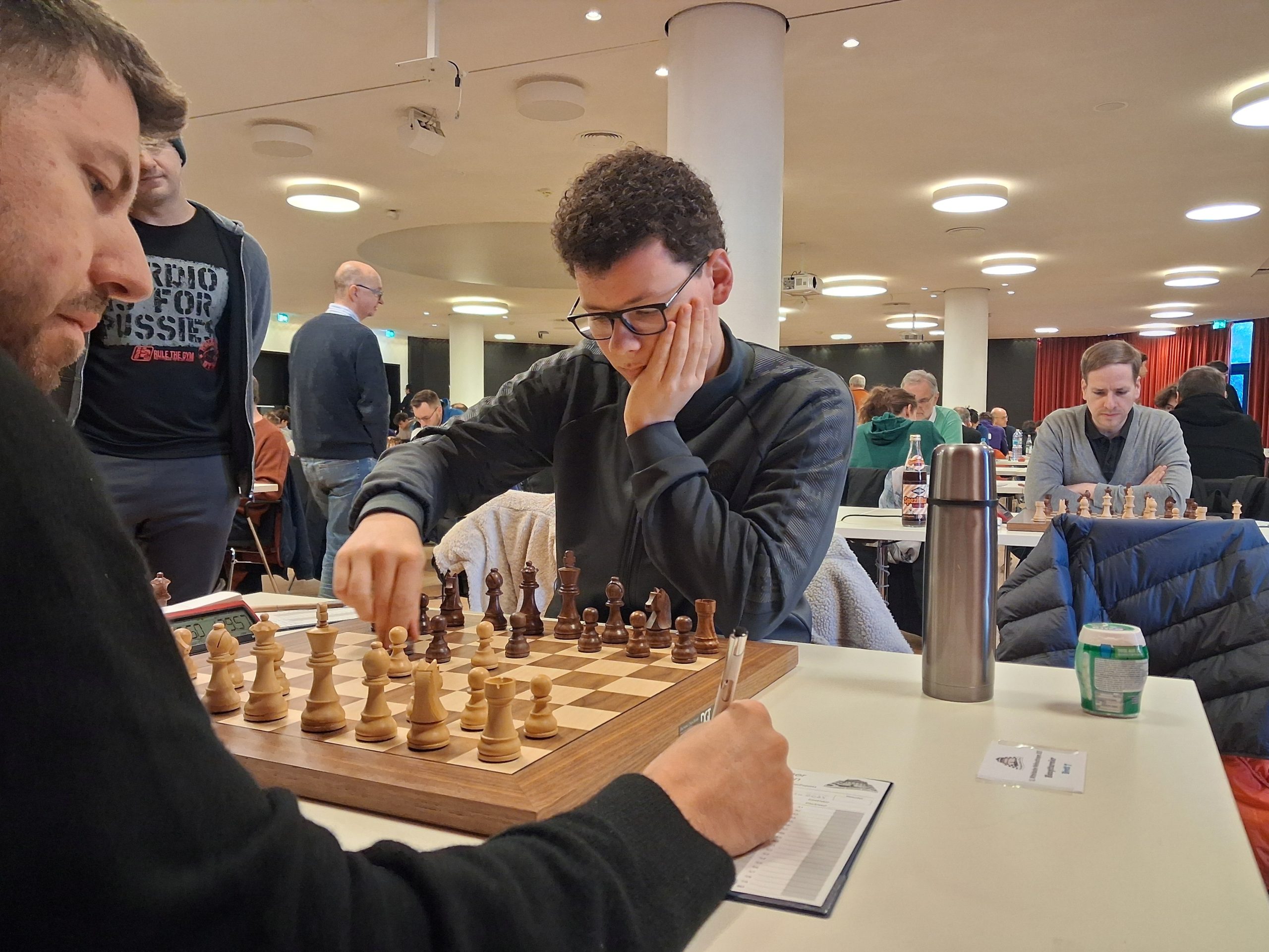 Während im Hauptturnier noch fast keine Partie zu Ende gegangen ist, hat das Begleitturnier gegen 12:30 Uhr bereits die erste Runde hinter sich. Fabian, Anton und Illia gingen siegreich aus ihren Partien hervor.