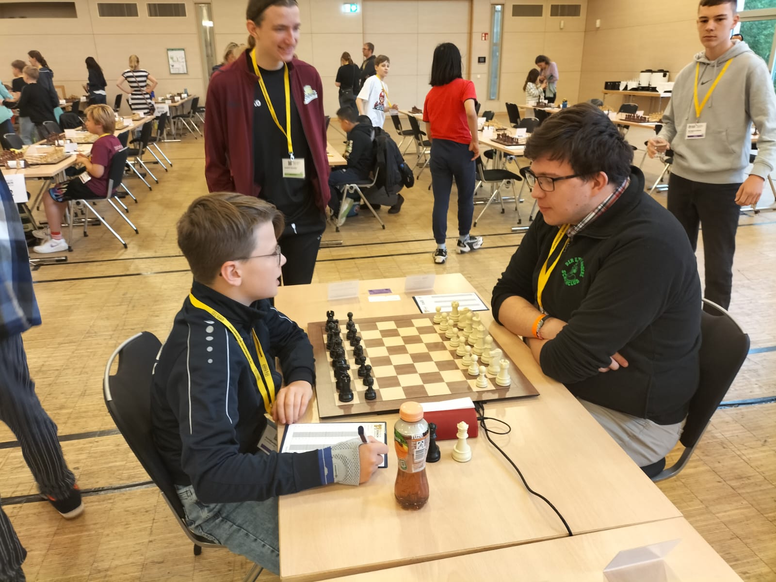 Auch Arnes Partie war kein Zuckerschlecken. Im Mittelspiel geriet er sogar ins Hintertreffen. Die meiste Zeit über hatte er mehr Material, konnte es aber nicht wirklich nutzen. Bis es ihm endlich gelang, vor dem gegnerischen König aufzuräumen und seine Dame ins Spiel zu bringen. Bei Matt in 5 gab der Gegner auf.