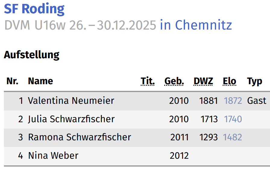 Wie bereits erwähnt konnte der SK Kelheim in diesem Jahr keine eigene U16w Mannschaft stellen, daraufhin entschloss sich Valentina Neumeier dazu, den Schachfreunden Roding als Gastspielerin auszuhelfen, denn auch Roding konnte nur drei Teilnehmerinnen aus den eigenen Reihen stellen. Beim Team der Schachkollegen aus der Oberpfalz ist die Sachlage etwas anders: