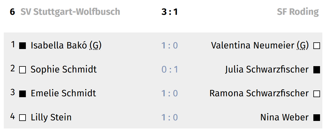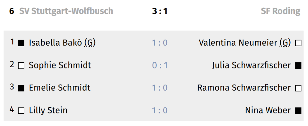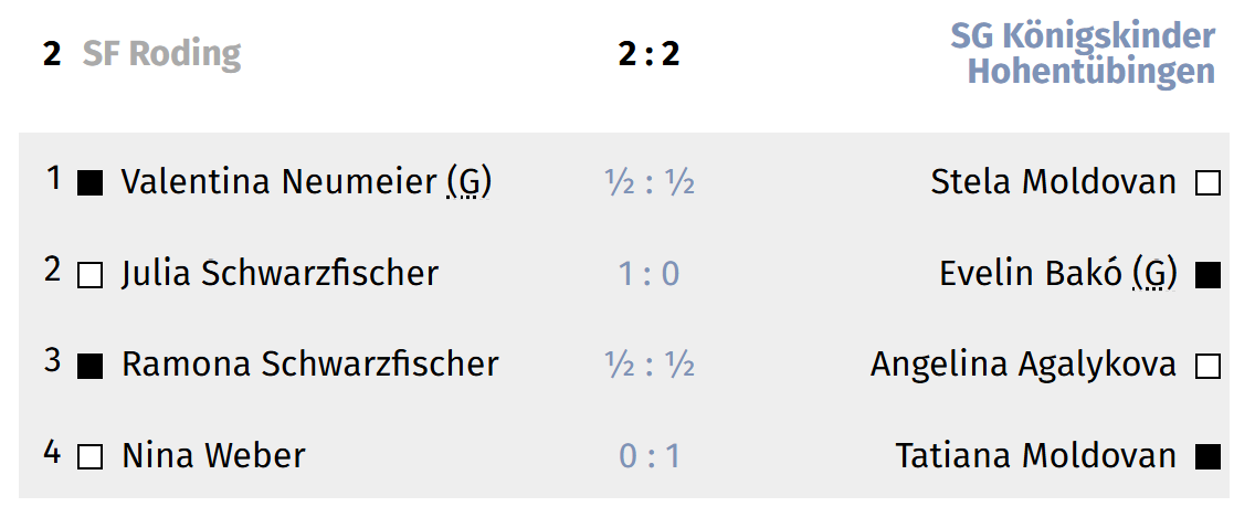 Gegen 13 Uhr vermeldete der SKK-Chat dann hingegen sehr erfreuliche Nachrichten aus Chemnitz: „Überraschung in Chemnitz: Die nur auf Rang 12 gesetzten Rodinger Mädchen schaffen ein 2:2 Unentschieden gegen den Setzlistenzweiten SG Königskinder Hohentübingen. Leni spielt Remis am Spitzenbrett.„
