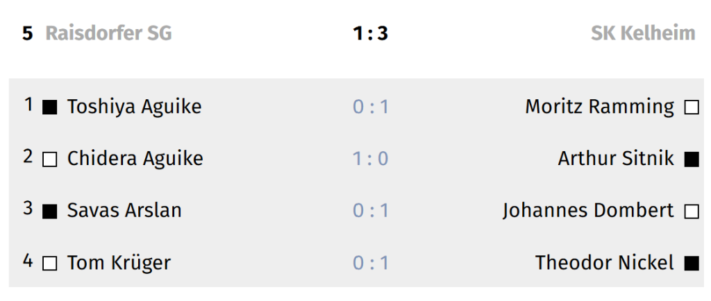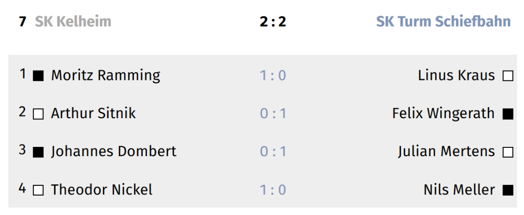 Soeben hat Theodor seine Partie gewonnen, sein Gegner musste zusehen, wie sich zwei seiner Bauern auf den Weg zur Grundreihe machten. Nachdem bis auf ein Leichtfigurenpaar bereits alles Material abgetauscht war, konnte er diesem Bauernsturm nichts mehr in den Weg setzen und gab vor der Umwandlung schließlich auf. Zwischenstand 2:1 für den SK Kelheim.
