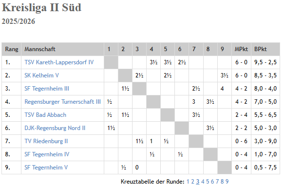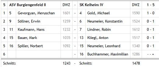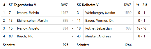 Parallel dazu spielte die fünfte Mannschaft in der Besetzung MF Maxim Weinberger, Werner Bauer, Sebastian Rothe und Andreas Meister auswärts gegen Tegernheim V. Auch hier zahlte es sich aus, dass keine Spieler abgegeben werden mussten – es stand ebenfalls eine starke Mannschaft bereit. Da Tegernheim, genauso wie Burglengenfeld, nicht in Bestbesetzung antreten konnte, sprachen die DWZ-Unterschiede auch die Favoritenrolle klar auf Kelheimer Seite aus.