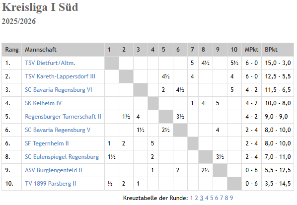 Die Stimmung im Kelheimer Team hätte nicht besser sein können, und auch die Niederlage am Spitzenbrett fiel angesichts des Gesamtergebnisses kaum ins Gewicht. Mit diesem deutlichen Erfolg schiebt sich die vierte Mannschaft am Mittelfeld vorbei und geht den nächsten Spieltag als Tabellenvierter an.