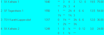 Die Zweite hingegen kam gegen Kareth-Lappersdorf unter die Räder. Nur Konsti schaffte am Spitzenbrett ein Remis. In Runde 3 musste nun SKK I gegen die Lappersdorfer ran. Die ließen jedoch nichts anbrennen und brachten ein lupenreines 4:0 nach Hause, während sich SKK II umgekehrt Tegernheim mit 0:4 geschlagen geben musste.