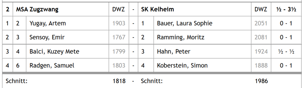 In Top-Aufstellung konnte der SK Kelheim mit Laura Bauer, Moritz Ramming, Peter Hahn und Simon Koberstein antreten. Auf dem Programm stand in der Vormittagsrunde das Duell gegen MSC 1836 München an, die Nachmittagsrunde sollte dann gegen MSA Zugzwang gehen.