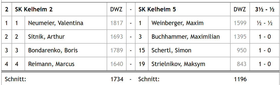 Auch am Nachmittag war es angesichts der spannenden Situation und vielen neugierigen Augen von Zuhause aus teilweise zu still, allerdings wurde bereits nach gut zwei Stunden Spielzeit die 2:0-Führung durch Laura und Moritz übermittelt. Damit war der Aufstieg bereits in sicheren Tüchern, an ein Unentschieden dachte zu dem Zeitpunkt aber keiner der vier Spieler. Simon konnte ebenfalls wieder den ganzen Punkt holen und identisch zum Vormittag erzielte Peter wieder ein Remis, Endstand also auch hier 3,5:0,5 für den SK Kelheim.