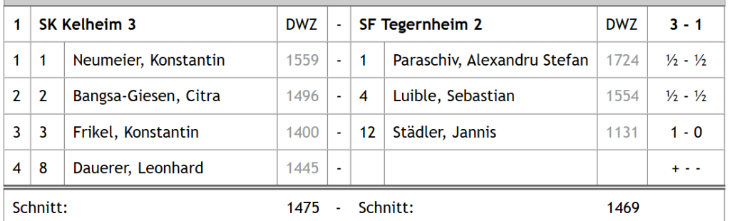 Über den SKK-Chat war es lange Zeit ruhig über etwaige Ergebnisse aus München. Ehe gegen halb zwei dann die Meldung über den souveränen 3,5:0,5-Sieg vermeldet wurde. Laura, Moritz und Simon konnten ihren Kontrahenten den ganzen Punkt abnehmen, Peter einigte sich auf eine Punkteteilung. Damit war ein weiterer Teil der Mission Wiederaufstieg in die Bayernliga abgeschlossen, die Mannschaft war bereits mit beiden Füßen über der Türschwelle, sollte in der letzten Runde nichts gravierendes mehr schief gehen.