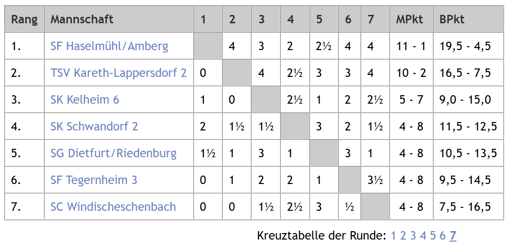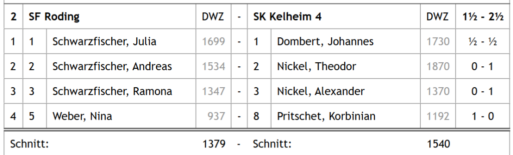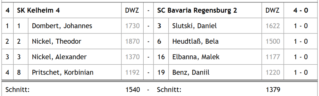 Mit dem Endstand in der Tabelle ist der SK Kelheim hier zwar ganz knapp an einem vierfach Erfolg vorbeigeschrammt, aber der über die Saison aufgekommen Slogan „Schachklub Kelheim-Liga“ trifft so und so natürlich perfekt zu. Auch hier feiert SK Kelheim II den ungeschlagenen Meistertitel und darf dank des Aufstiegs von SK Kelheim I in der nächsten Saison deren Platz in der U20 Landesliga übernehmen. SKK III, IV und V werden zur neuen Spielzeit nach wie vor in der U20 Oberpfalzliga an den Start gehen dürfen.
