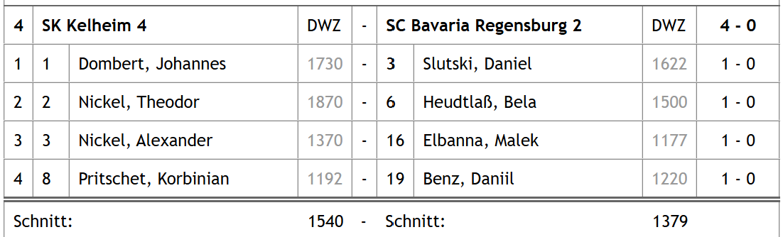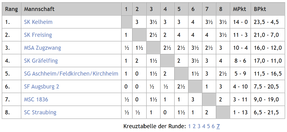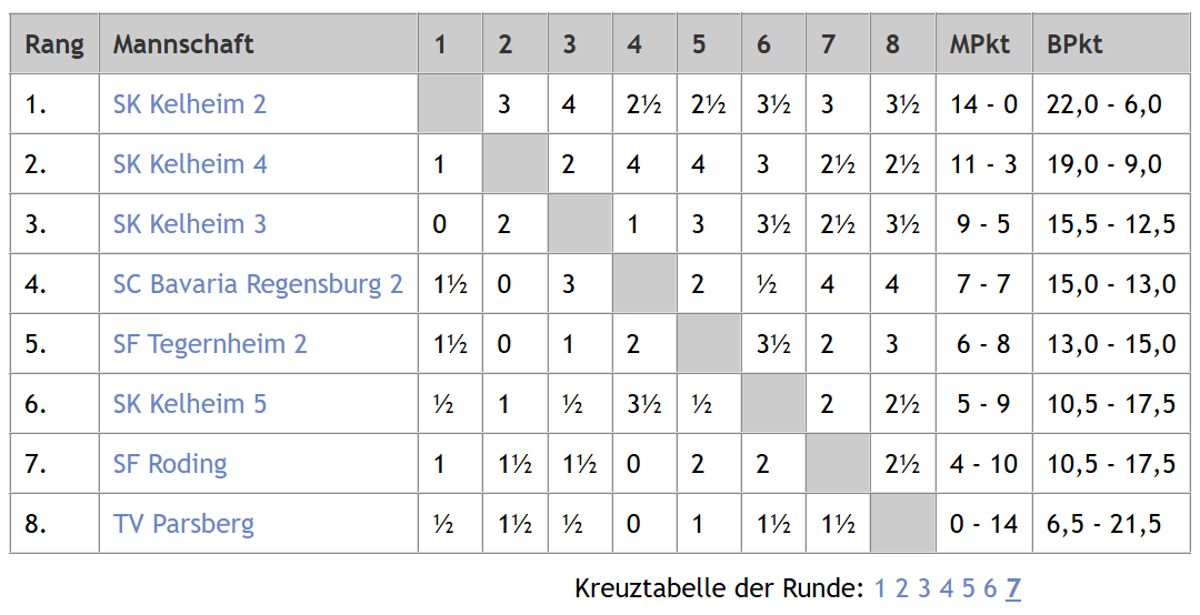Mit dem Endstand in der Tabelle ist der SK Kelheim hier zwar ganz knapp an einem vierfach Erfolg vorbeigeschrammt, aber der über die Saison aufgekommen Slogan „Schachklub Kelheim-Liga“ trifft so und so natürlich perfekt zu. Auch hier feiert SK Kelheim II den ungeschlagenen Meistertitel und darf dank des Aufstiegs von SK Kelheim I in der nächsten Saison deren Platz in der U20 Landesliga übernehmen. SKK III, IV und V werden zur neuen Spielzeit nach wie vor in der U20 Oberpfalzliga an den Start gehen dürfen.