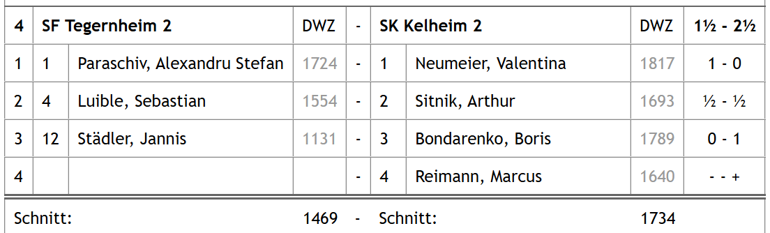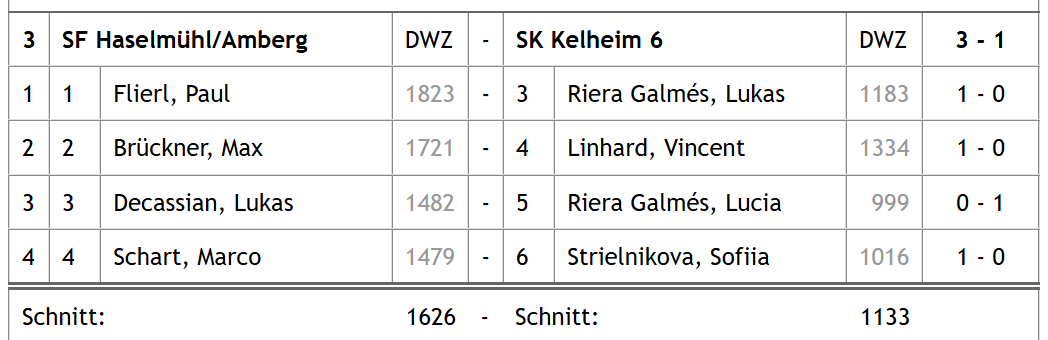 Über den SKK-Chat war es lange Zeit ruhig über etwaige Ergebnisse aus München. Ehe gegen halb zwei dann die Meldung über den souveränen 3,5:0,5-Sieg vermeldet wurde. Laura, Moritz und Simon konnten ihren Kontrahenten den ganzen Punkt abnehmen, Peter einigte sich auf eine Punkteteilung. Damit war ein weiterer Teil der Mission Wiederaufstieg in die Bayernliga abgeschlossen, die Mannschaft war bereits mit beiden Füßen über der Türschwelle, sollte in der letzten Runde nichts gravierendes mehr schief gehen.