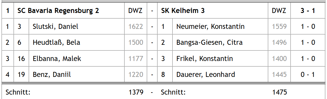 Einen sehr starken Ehrenpunkt konnte Lucia eintüten, die restlichen Partien gingen leider allesamt verloren, der Endstand lautete 1:3 aus Kelheimer Sicht. Nach kurzer Stärkung durch die vom Ausrichter bereitgestellten Leberkässemmeln ging es für die Nachwuchsspieler wieder nach Hause. Immerhin konnte so noch der Nachmittag für andere Aktivitäten genutzt werden.