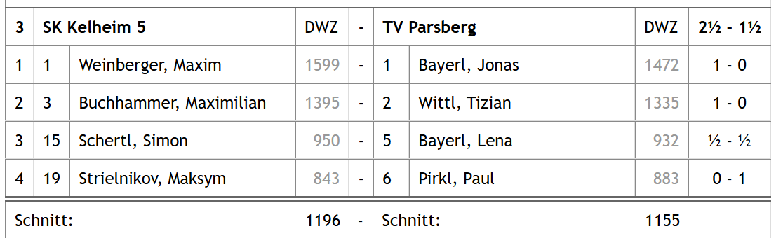 Auch am Nachmittag war es angesichts der spannenden Situation und vielen neugierigen Augen von Zuhause aus teilweise zu still, allerdings wurde bereits nach gut zwei Stunden Spielzeit die 2:0-Führung durch Laura und Moritz übermittelt. Damit war der Aufstieg bereits in sicheren Tüchern, an ein Unentschieden dachte zu dem Zeitpunkt aber keiner der vier Spieler. Simon konnte ebenfalls wieder den ganzen Punkt holen und identisch zum Vormittag erzielte Peter wieder ein Remis, Endstand also auch hier 3,5:0,5 für den SK Kelheim.