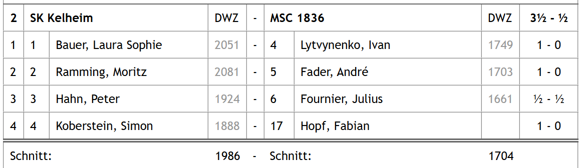 In Top-Aufstellung konnte der SK Kelheim mit Laura Bauer, Moritz Ramming, Peter Hahn und Simon Koberstein antreten. Auf dem Programm stand in der Vormittagsrunde das Duell gegen MSC 1836 München an, die Nachmittagsrunde sollte dann gegen MSA Zugzwang gehen.