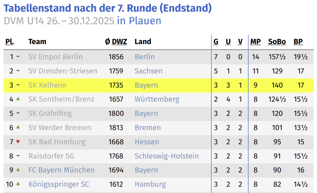 Unmittelbar nach den Weihnachtsfeiertagen standen für den Kelheimer Schachnachwuchs die Deutschen Vereinsmeisterschaften (DVM) an. Während die U14 ihre Titelkämpfe in Plauen austrug, fand die DVM der U16w in Chemnitz statt. Der SK Kelheim war in beiden Wettbewerben vertreten – mit herausragendem Erfolg. Über den gesamten Turnierverlauf hatten wir in unserem, mehrere Seiten umfassenden Liveticker berichtet.