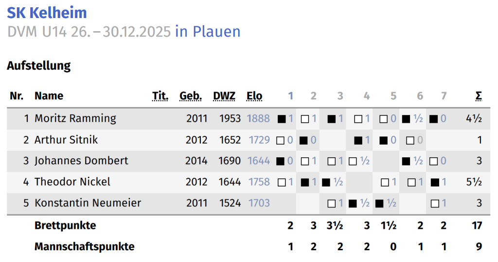 In der Altersklasse U14 ging der SK Kelheim mit Moritz Ramming, Arthur Sitnik, Johannes Dombert, Theodor Nickel und Konstantin Neumeier an den Start. Die Teilnahme war keineswegs selbstverständlich: Nach dem Ausscheiden auf Landesebene erhielt das Team dank eines Freiplatzes der Deutschen Schachjugend doch noch die Möglichkeit, sich auf nationaler Ebene zu messen.
